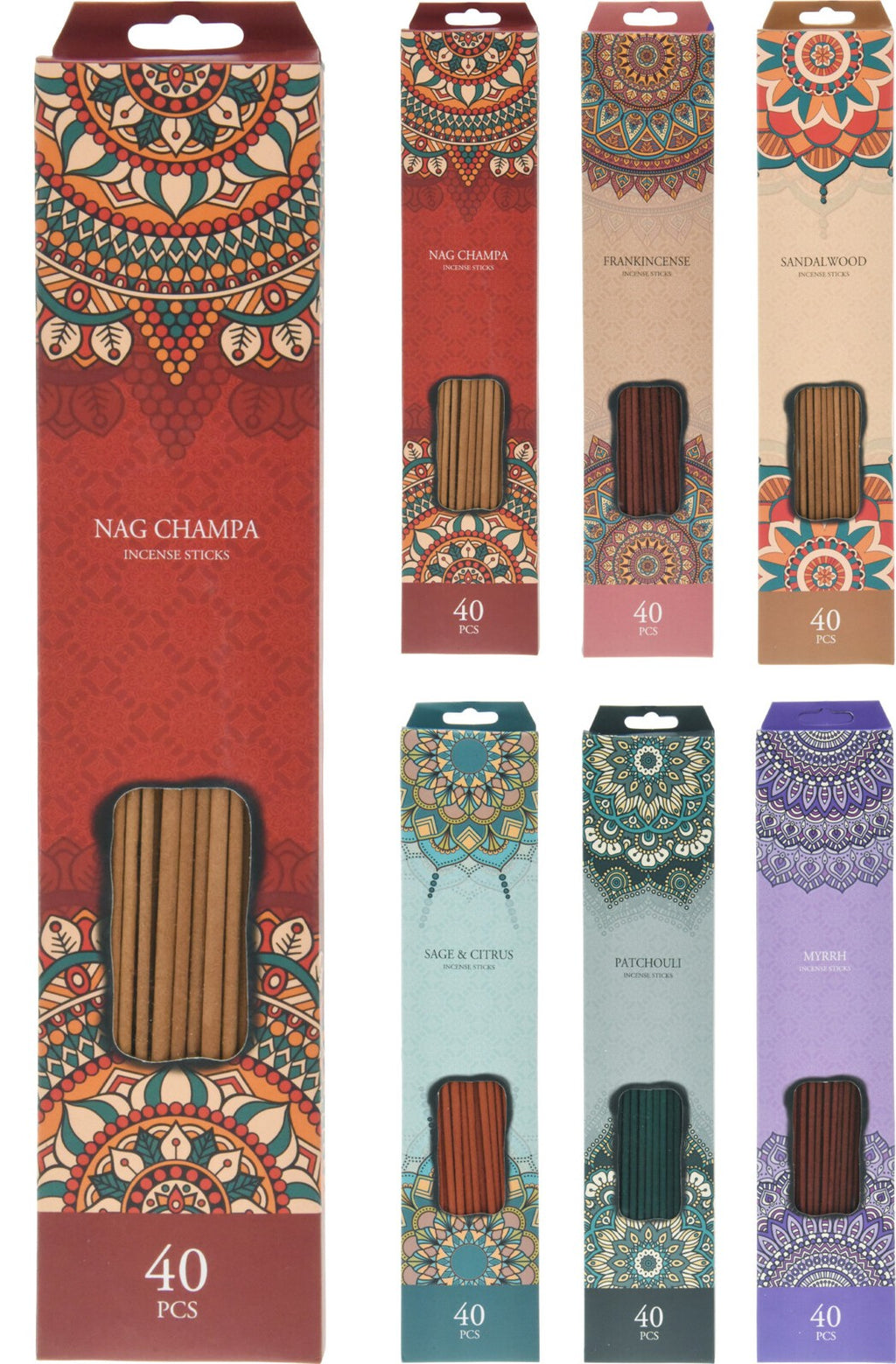 This pack of 40 incense sticks features six assorted scents: Frankincense, Nag Champa, Patchouli Sandalwood, Sage and Citrus, and Myrrh. Each stick measures 255mm in length. Perfect for creating a calming atmosphere or enhancing your meditation and relaxation routines.