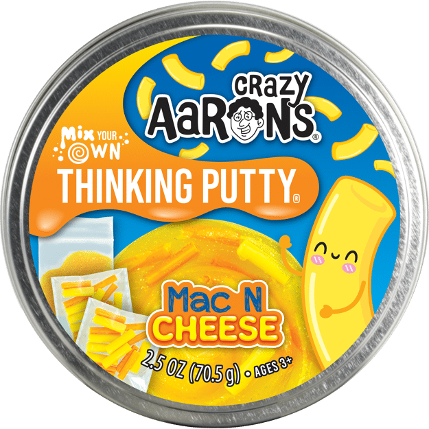 Mix your own Mac N Cheese Thinking Putty! Everything you need is included in the tin. Simply mix the color-izer with the clear putty, add your mix-in, then play!