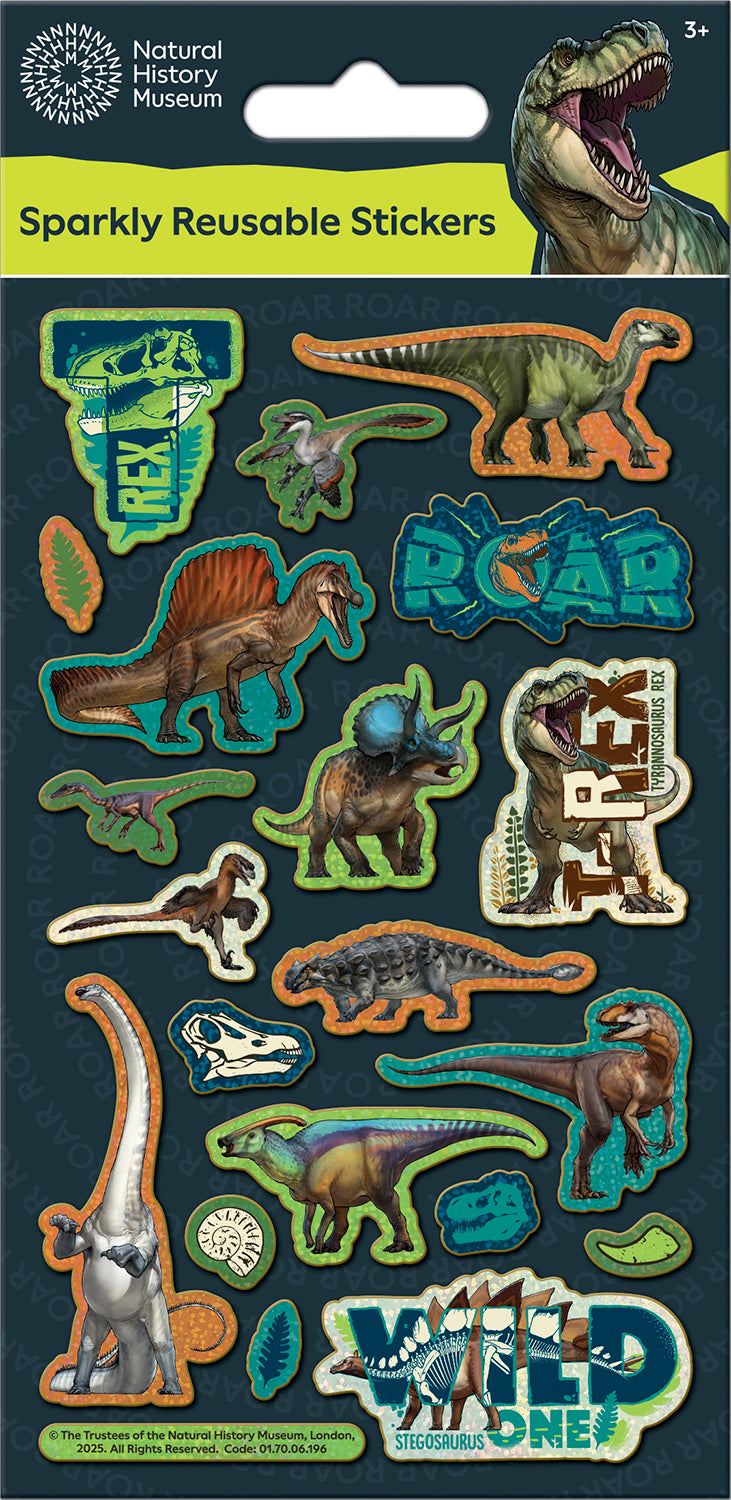 One sheet of reusable foiled stickers featuring The Natural History Museum Dinosaurs packaged with an illustrated backing board. Perfect for decorating books, folders, laptops, pencil cases, bikes, cards, and anything else you can think of!