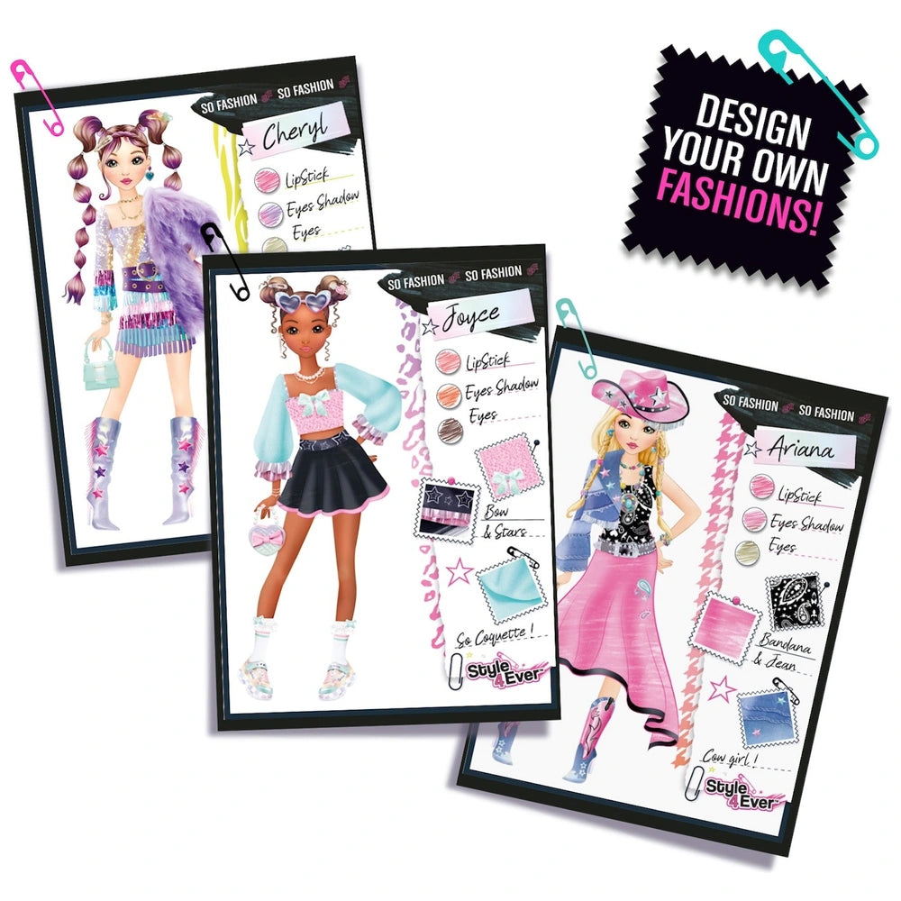- Contents: 1x Style 4 Ever Fashion Designer Studio; 1x Dual-Tip Marker; 6x Pencil Crayons; 3x Stencils; 20x Model Sheets; 10x Printed Sheets; 6x Printed Design Rolls; 5x Self-Adhesive Fabric Sheets; 50x Gems; 2x Sticker Sheets; 1x Glue Stick; 1x Guide Book