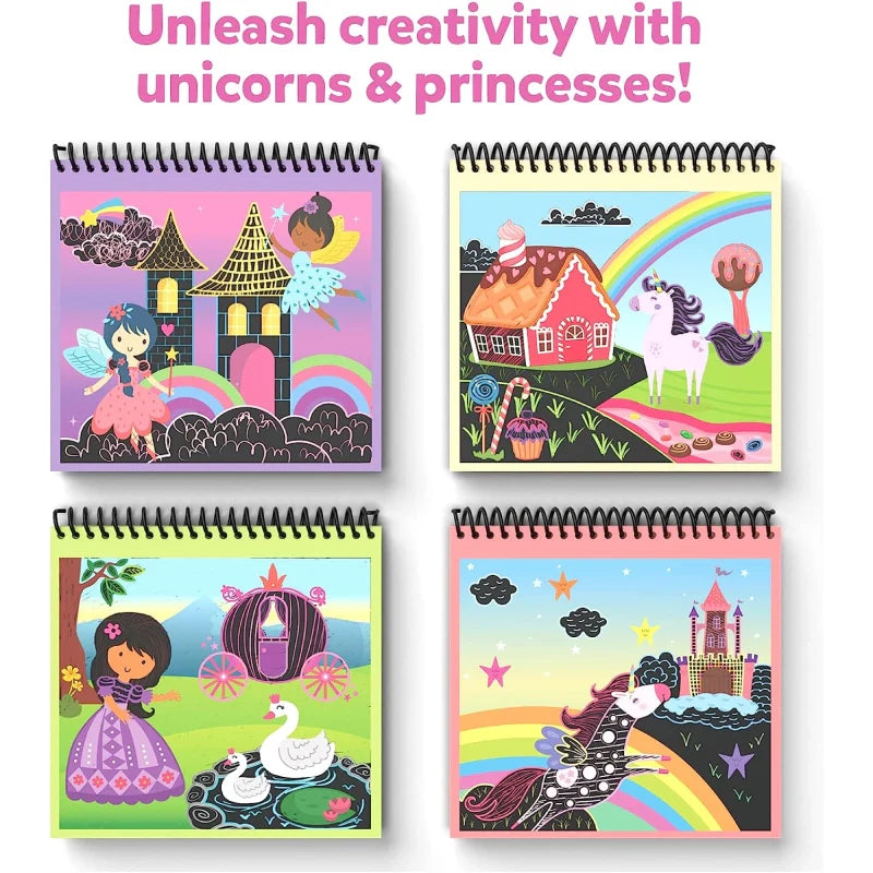 Unleash the joy of artistic discoveries with this travel-friendly DIY Scratch Art Book featuring magica unicorns & princesses. It’s more than just a craft kit – it takes your little one to a magical world where creativity and imagination knows no bounds!