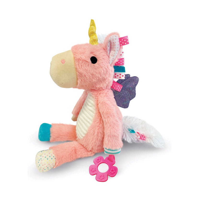 Explore the magical Sensory Snuggables Unicorn to stimulate and engage your little one’s senses. Jiggle the unicorn to hear the chime rattle, squish its wings to discover the surprise crinkles then squeeze and grip the unicorn’s nose to hear it squeak! There is a tough teether to help soothe sore gums, as well as bright ribbon tags to tug and a variety of soft textures and colourful patterns to explore together. With so much to discover, it’s time to come and play!