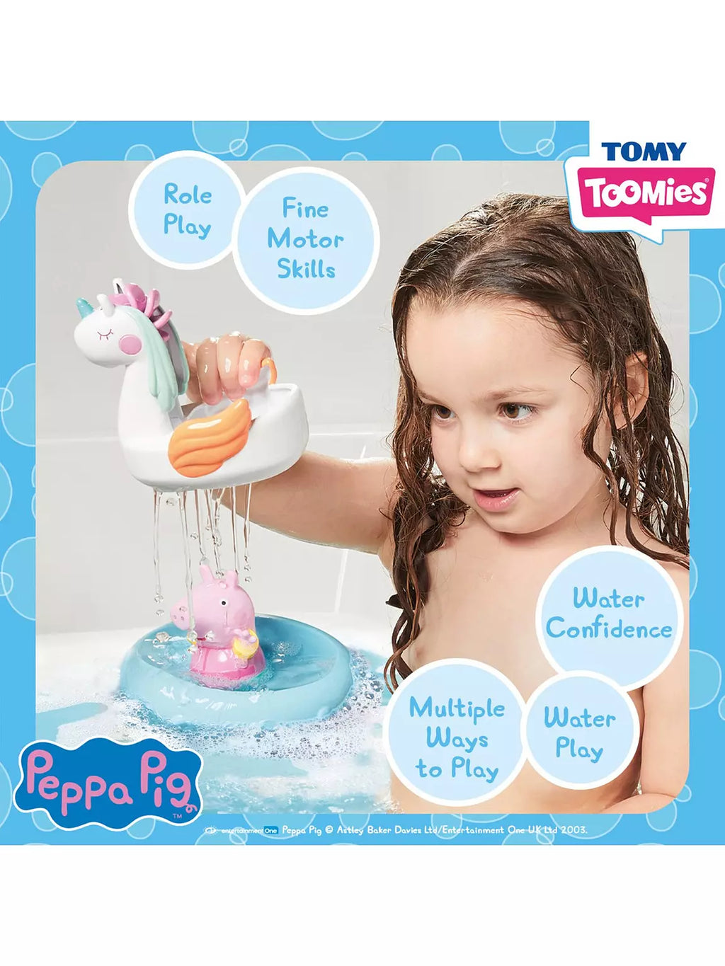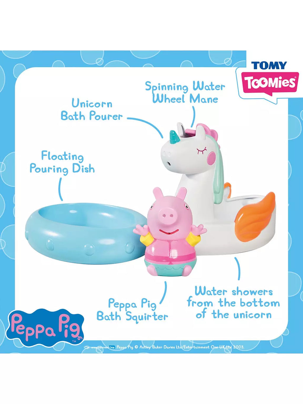 This clever bath toy has all the makings of a magical escape. It comes in three parts: a circular base that behaves like a floating ring; a unicorn that sits on top and collects water; plus a little Peppa Pig figure that's soft and squidgy and rides the unicorn. Take them apart, swap them around and discover the fun! Sit Peppa in the circular ring, fill the unicorn with water and shower her with the water through the base or tilt and sprinkle a trickle through the unicorn's mouth. Then, take turns with Peppa and discover how she squirts water through her mouth after a quick dip and a squeeze in the tub. Point the jet at the unicorn's mane for a magical surprise: the mane acts like a paddle you can send in a spin.