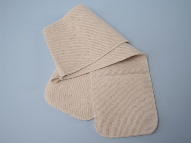 Pair of warp knitted oven gloves with double thickness on the palm. Meausring 91 x 17cm.