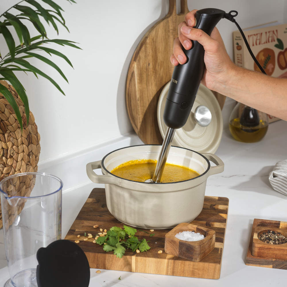 Bring flair to your kitchen with the Salter Alchemy 3-in-1 Hand Blender Set, designed with a stunning black and gold finish. Whether you're blending silky sauces, chopping fresh salsa, or whipping up bruschetta toppings, this chopper is perfect for every single recipe. With stainless steel blades and 2 speed settings, you can customise your consistency however you like it. Thanks to the 500ml chopping bowl and 700ml storage beaker you can prep like a pro and store away leftover after use.