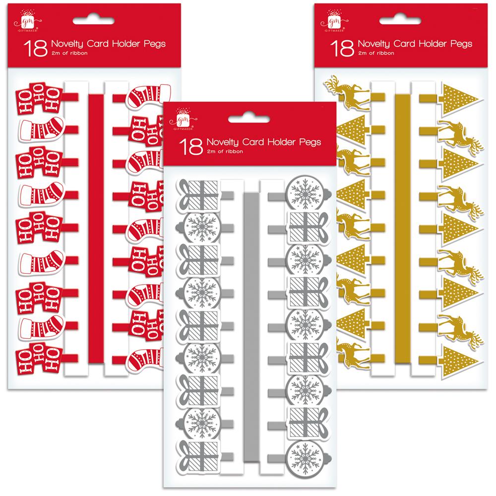 Novelty card holder with 18 pegs & 2m of ribbbon. Perfect for displaying all of your Christmas cards.