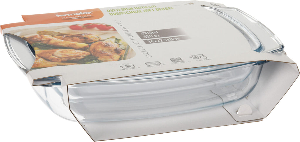 This oven dish, made from heat-resistant glass, has a generous capacity of 4100ml (138.65oz) and includes a lid.