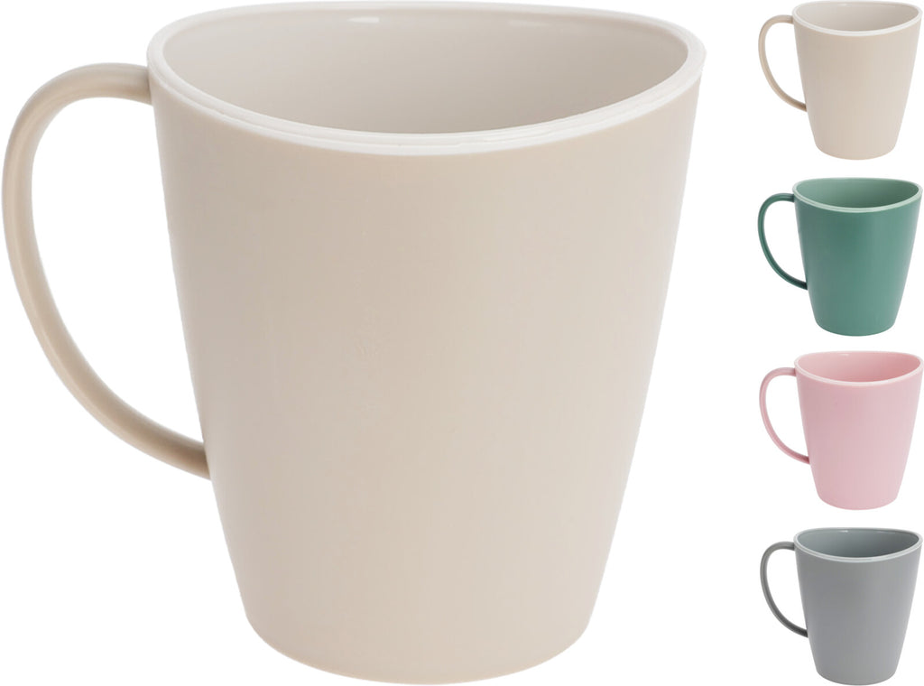 Plastic mug with white inside and 4 assorted colour on the outside, perfect for camping or using outdoors.