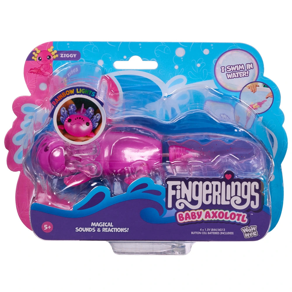 Make a splash with Ziggy the Fingerlings Baby Axolotl, the magical magenta-pink interactive pet that comes to life in and out of the water! With glittery gills that glow in a rainbow of colours, Ziggy really swims when placed in clean, fresh water in a bowl, pool, or aquarium.