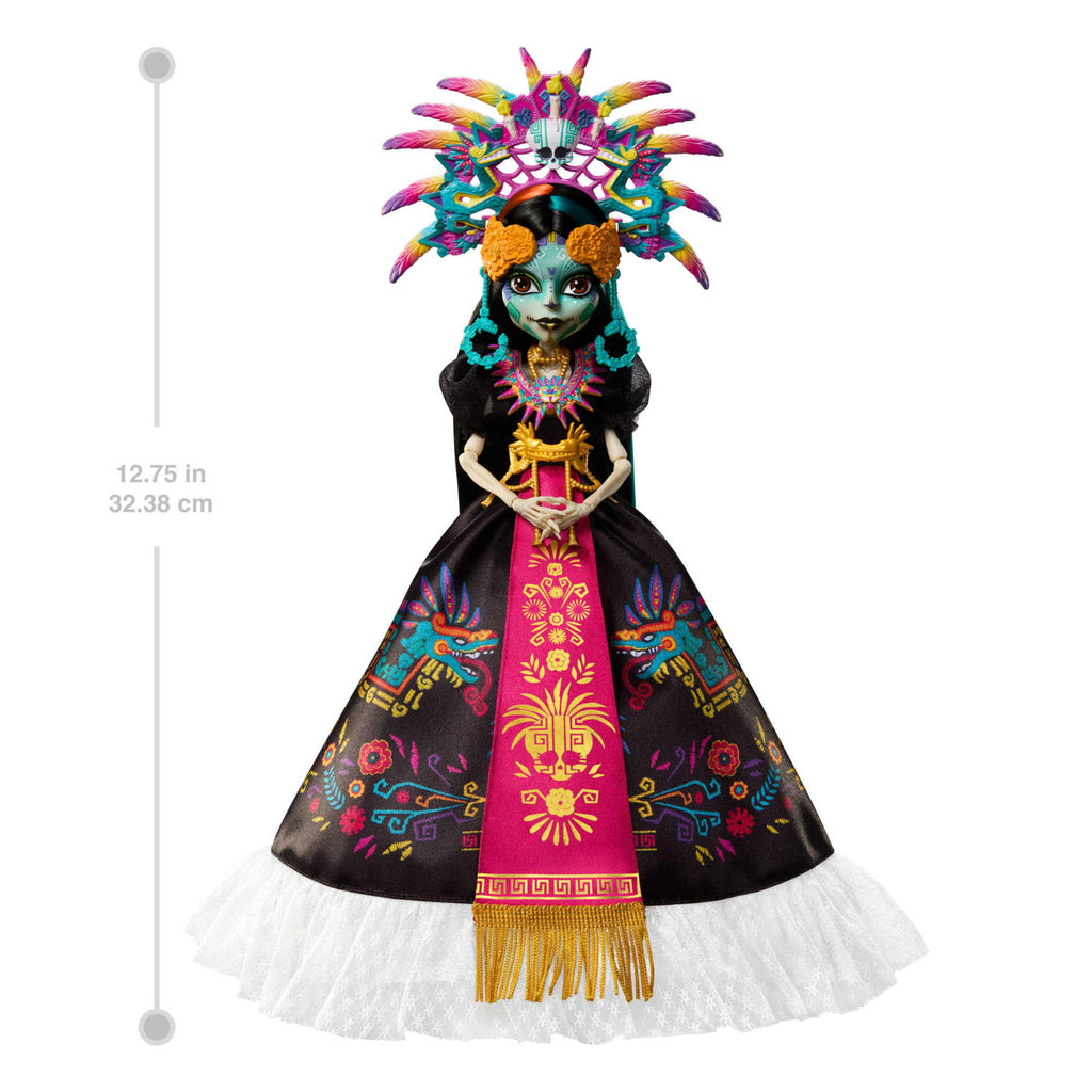 kelebrate Día de Muertos with a stunning Monster High doll! When designing this year’s howliday gown, Skelita Calaveras looked to her Aztec scare-itage for inspiration. Her vibrant, jewel-toned skirts and headdress depict Quetzalcóatl, the powerful Feathered Serpent associated with wisdom, wind, and creation. Splashes of bright color light up her dark satin gown, just as ofrenda candles light up the night! Skelita Calaveras is a unique keepsake for anyone looking to honor this special time of remembrance. Doll cannot stand alone. Colors and decorations may vary.