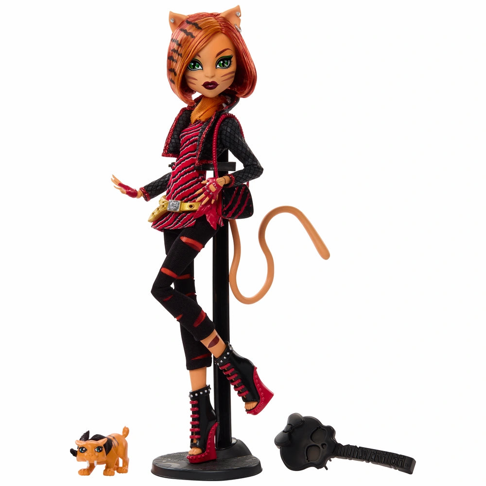 The Monster High Toralei doll returns in a fierce reproduction, bringing back her signature cat-titude and edgy style. Originally released in 2011, she stuns in her classic red and black look, featuring a tiger-striped blouse, faux leather jacket, and clawed-up capri pants. Her chic bob, neck scarf, fingerless gloves, and studded heels add extra feline flair.