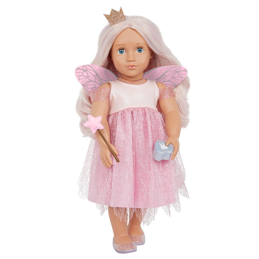Dream up magical stories with Tooth Fairy Twinkle! This Our Generation 46cm doll has bright blue eyes that open and close, and her long, sparkly blonde hair is so much fun to style! Twinkle is on the lookout for friends who have lost their tooth, and she can't wait to wave her wand to give them a special surprise (this set includes 3 coins that fit inside the piggy bank)! She arrives wearing an enchanting fairy dress with a shimmer overlay, fairy wings, a star wand, and a pair of clear shoes. Her outfit also comes complete with a charming crown! Did someone lose their baby tooth? Yay! Fill out the tooth certificate to celebrate. Then place the tooth in Twinkle's tooth fairy box for safekeeping - it really holds a child's lost tooth so both dolls and kids can enjoy fairy tale fun together!