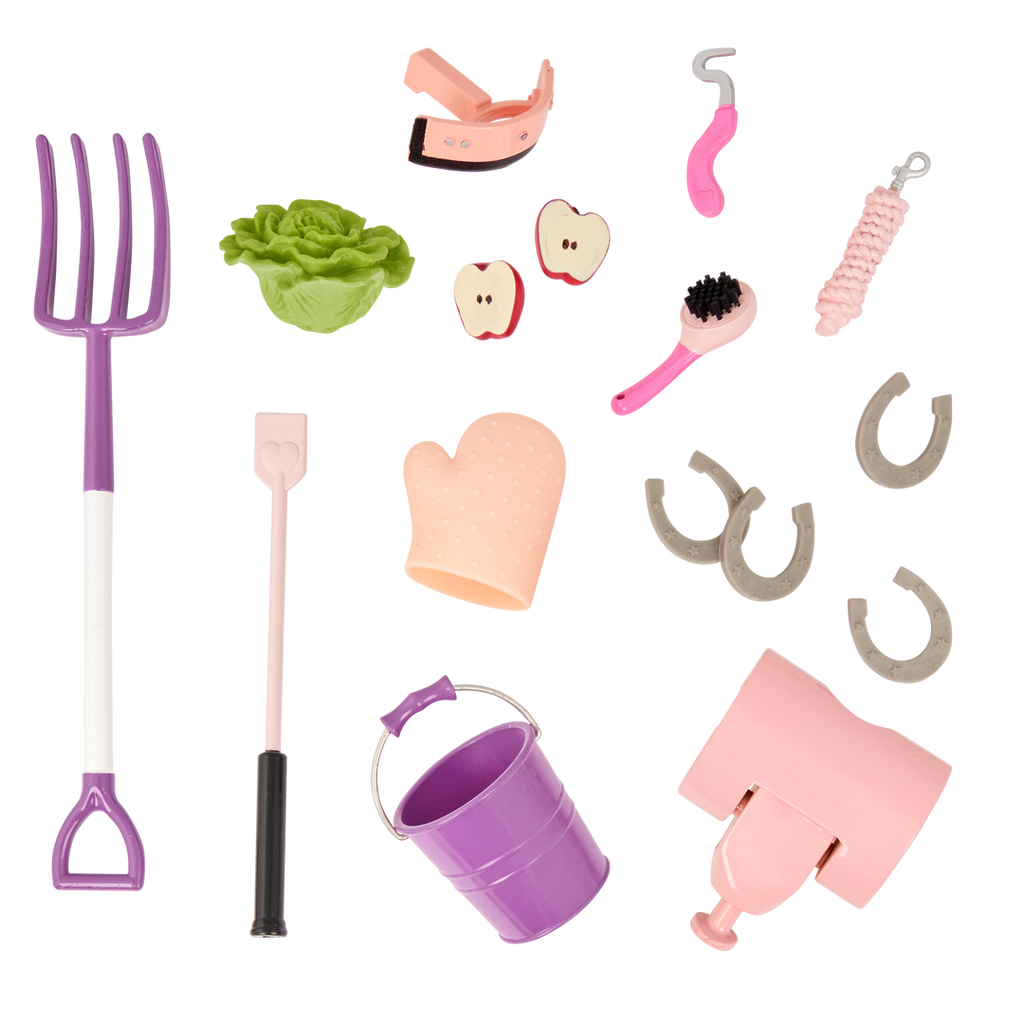 Includes: A pink horse trailer, trailer hitch, a tether rope, riding crop, pitchfork, grooming brush, hoof pick, scraper, lettuce, 2 apple halves, 4 horseshoes, a grooming mitten, and a bucket.