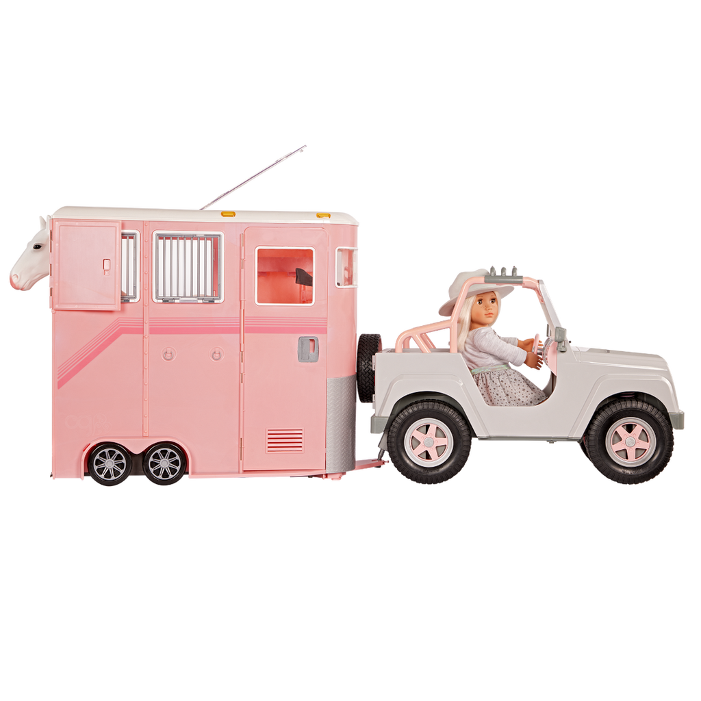 17-piece Pink Horse Trailer Playset: The Our Generation Mane to Travel Horse Trailer is the perfect equestrian accessory for 46cm dolls and their favourite 20-inch horse pals!