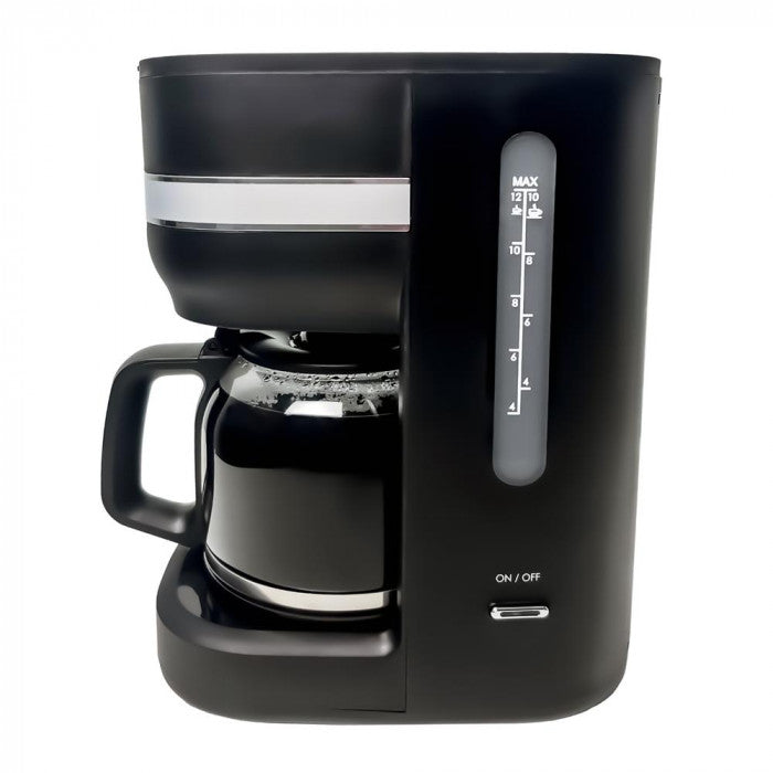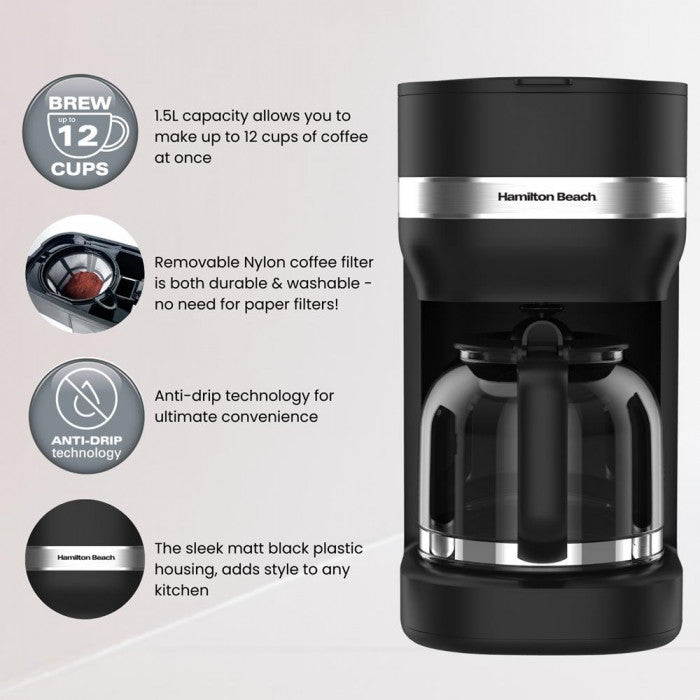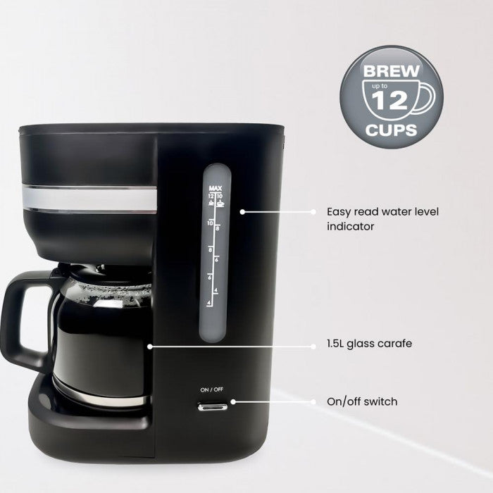 Ella Coffee Maker in Black makes brewing coffee effortless with its 1.5L capacity and 60-second anti-drip feature. The washable Nylon filter reduces paper waste while the window allows you to monitor water levels. Its sleek matte black design adds style to functionality. Elevate your coffee experience with Ella.
