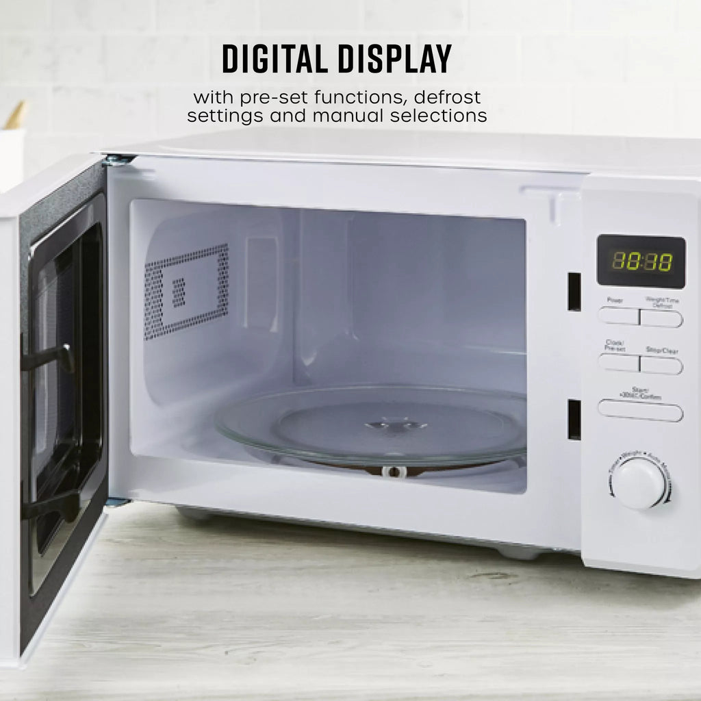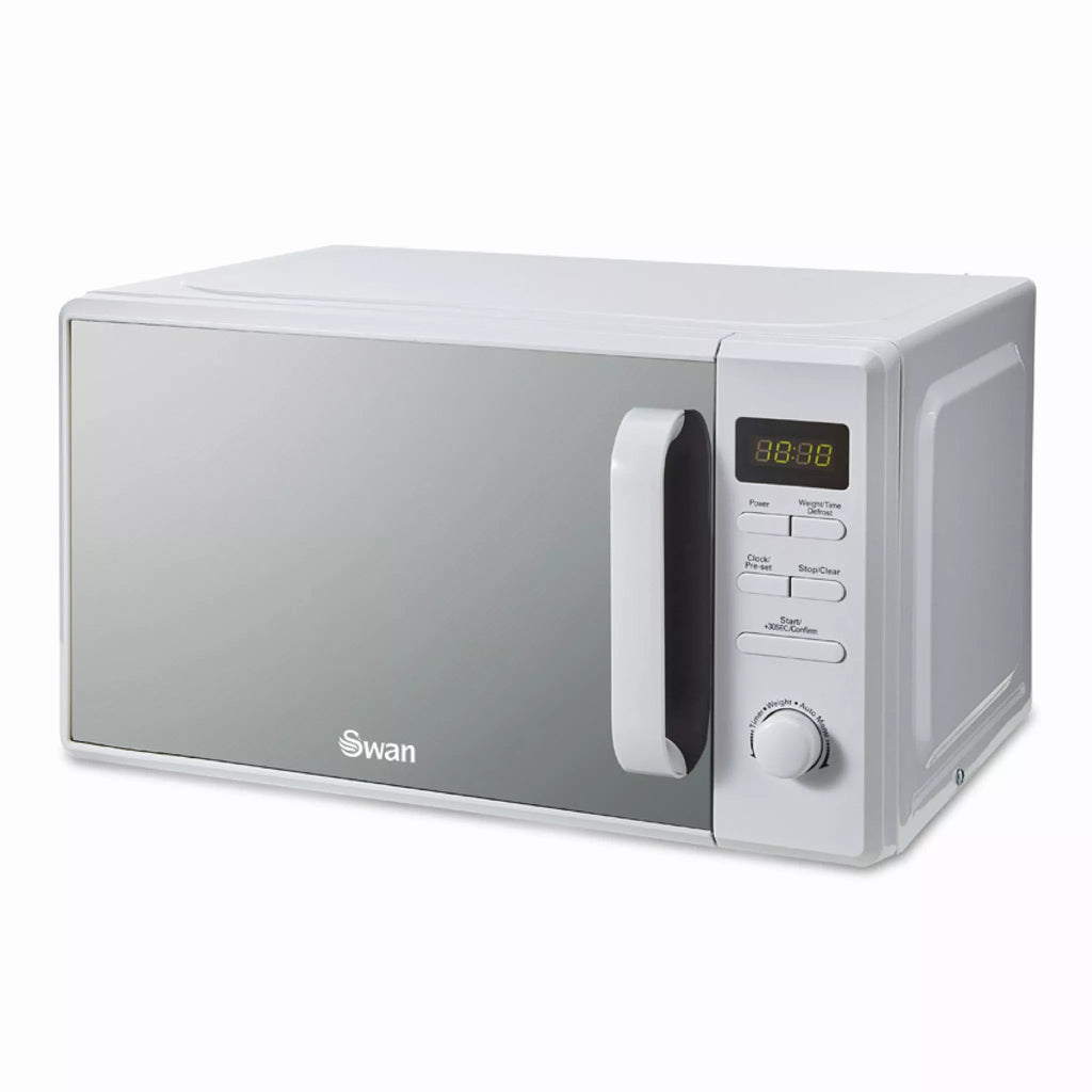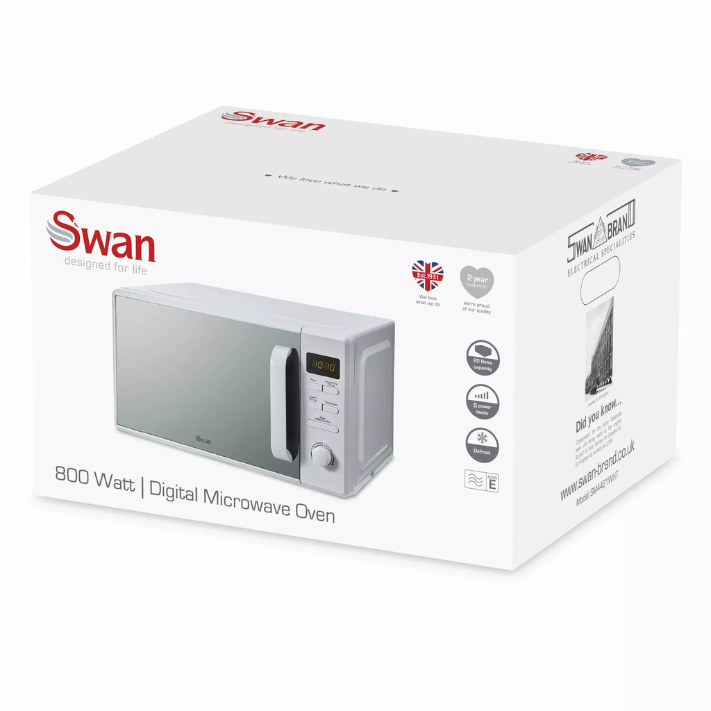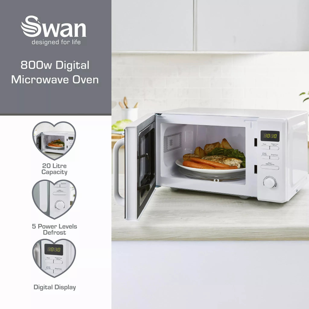The Swan 20L Digital Microwave is a stylish addition to your kitchen. With easy to use functions, it makes mealtimes effortless. Featuring 5 power levels, whether you’re warming soup or heating up a ready meal, you get full control over your mealtimes. Simple button controls and manual dial with a clear LED digital display give you quick access to 7 Auto Cook presets for Pizza, Potato, Popcorn, Frozen Dinner, Beverage and Reheat. If you need to thaw something fast, simply use the Defrost function by either time or weight to get accurate results without overcooking. It’s also the perfect family size microwave, with a 20L cavity that fits a 10-inch dinner plate—perfect for meals, quick lunches or snacks. Additional features include audible cooking alerts, and removable glass tray, making it user-friendly and easy to clean. Stylish yet affordable, this defrost microwave brings together performance and convenience to make everyday life simpler.