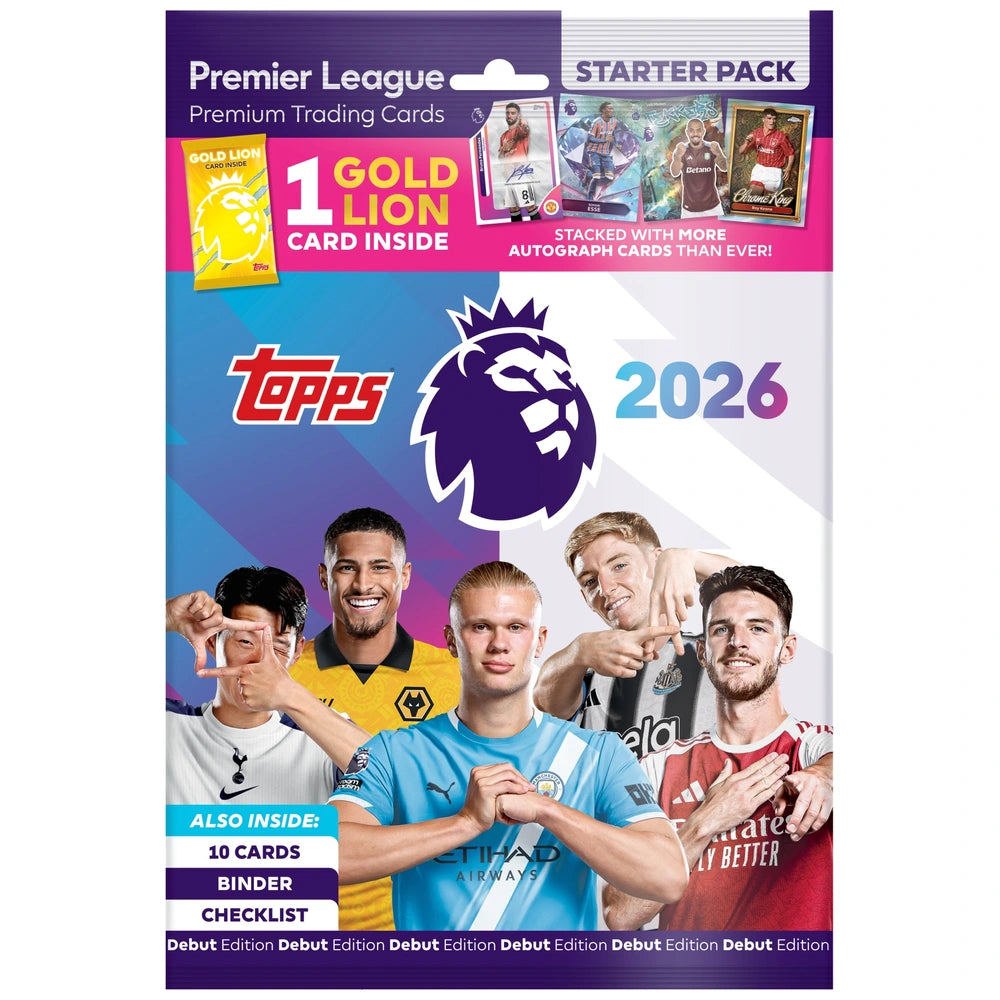 The Topps Premier League Trading Card Game: 2026 Debut Edition Starter Pack contains 10 trading cards plus a Gold Lion card. You'll also get a comprehensive Product Information Guide to the rare chase cards and parallels that can be found in the collection along with a Binder and Checklist. This innovative trading card collection brings fans closer than ever before to the new heroes of the Premier League.