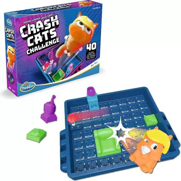 Introducing Crash Cats by ThinkFun, the sliding back block puzzle that sends cats flying! Pick the challenge, set up the board, and slide those cats! The cats slide all the way until they are sent flying. Crash the yellow helmeted cat so only the red helmet cat remains. With challenges from beginner to expert, you'll be sliding and crashing cats for hours.