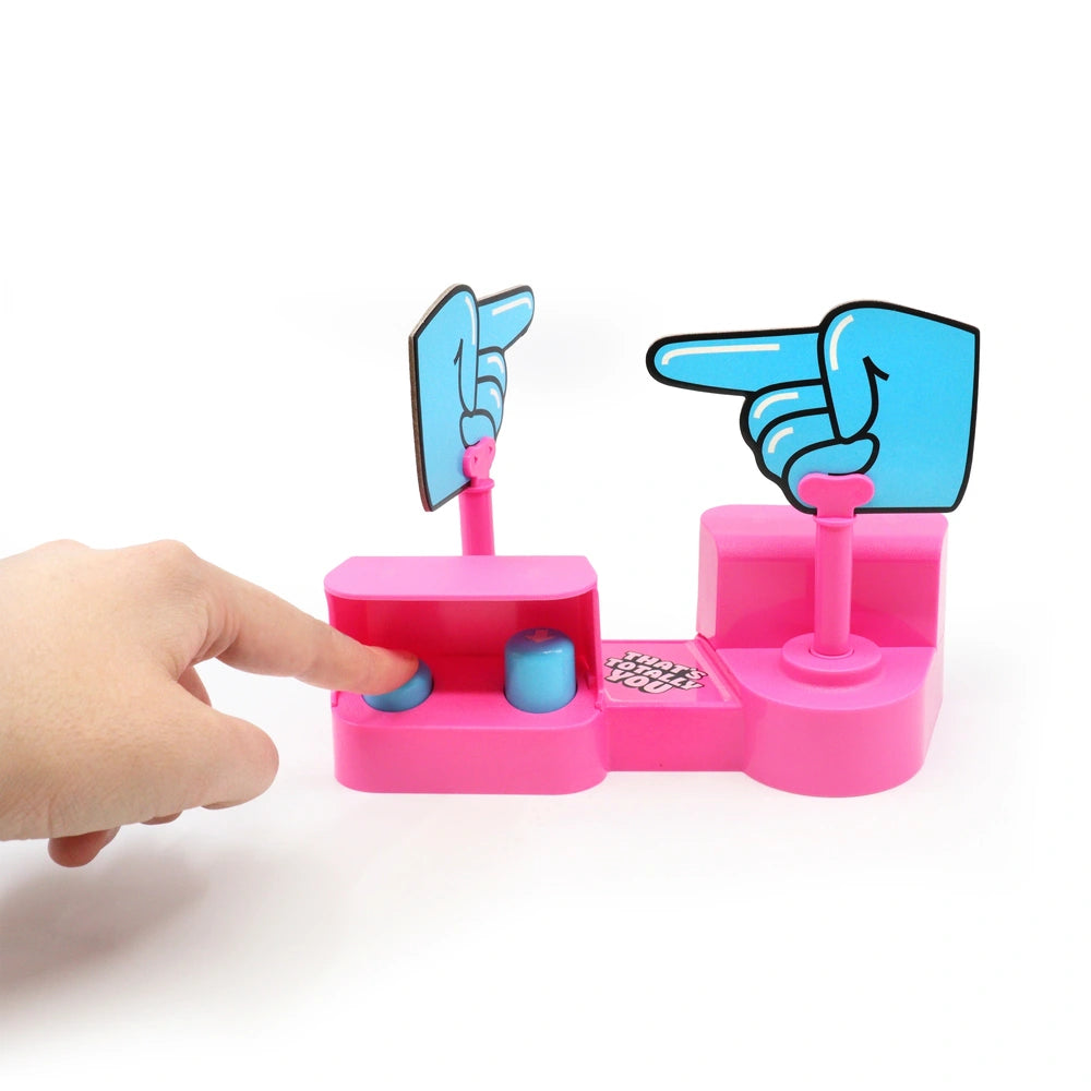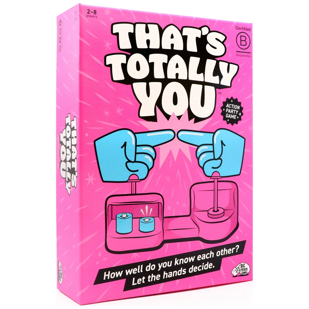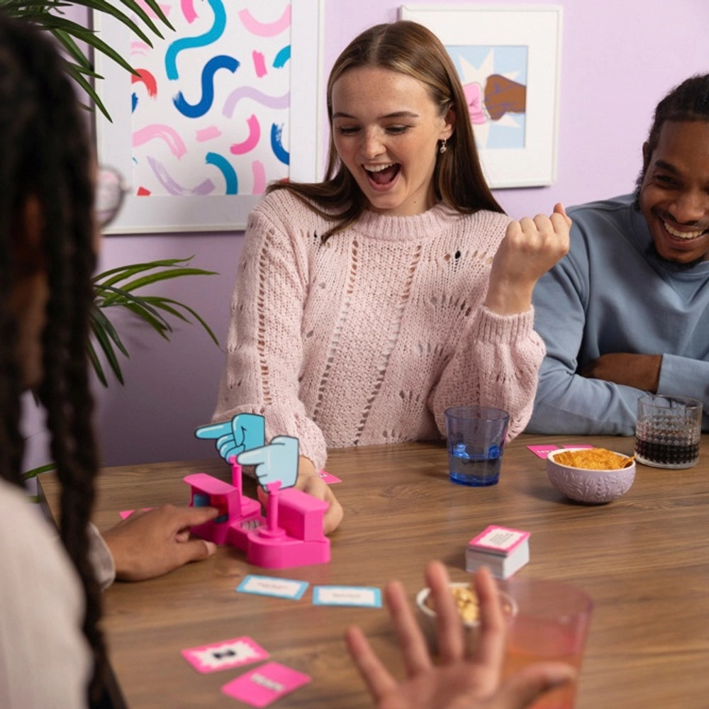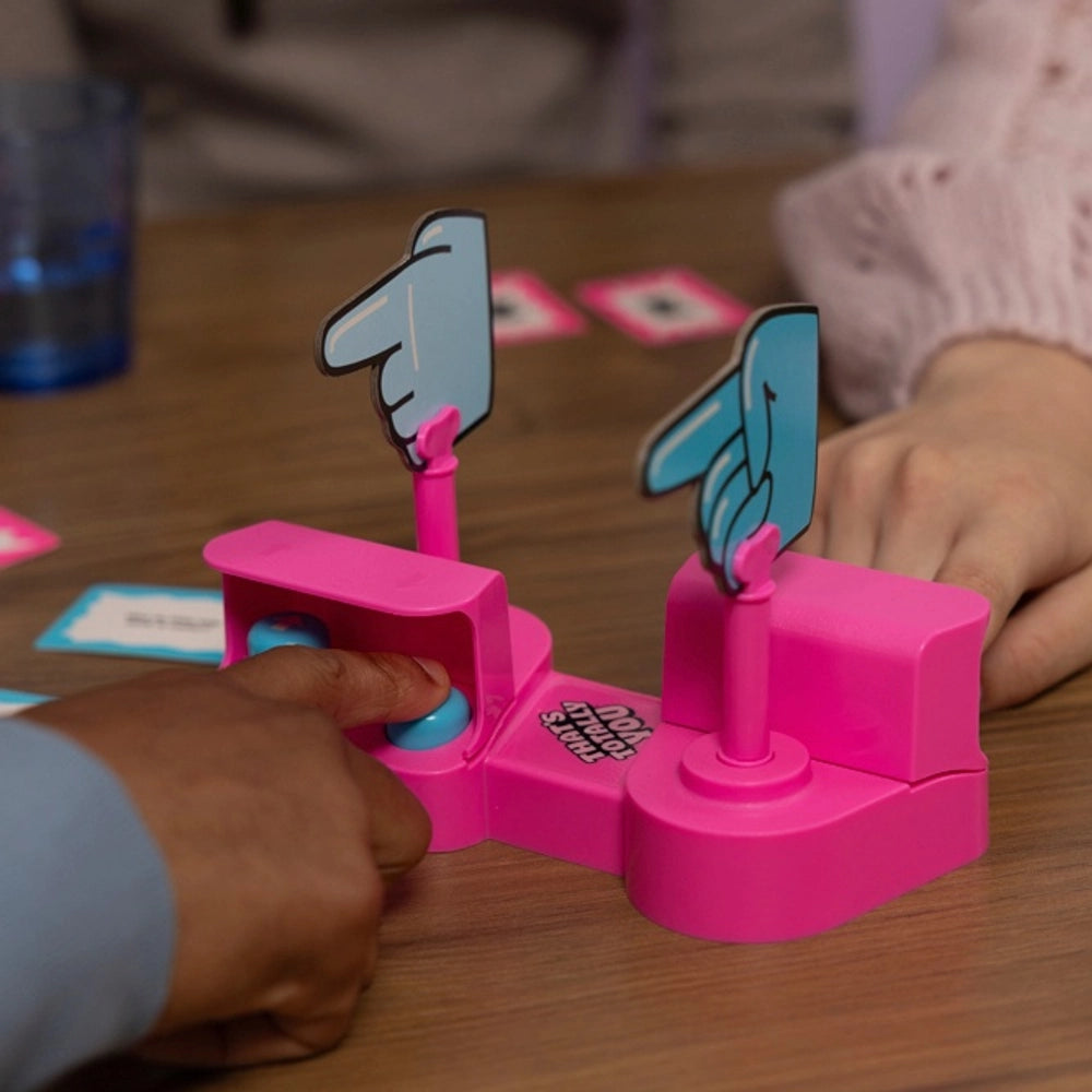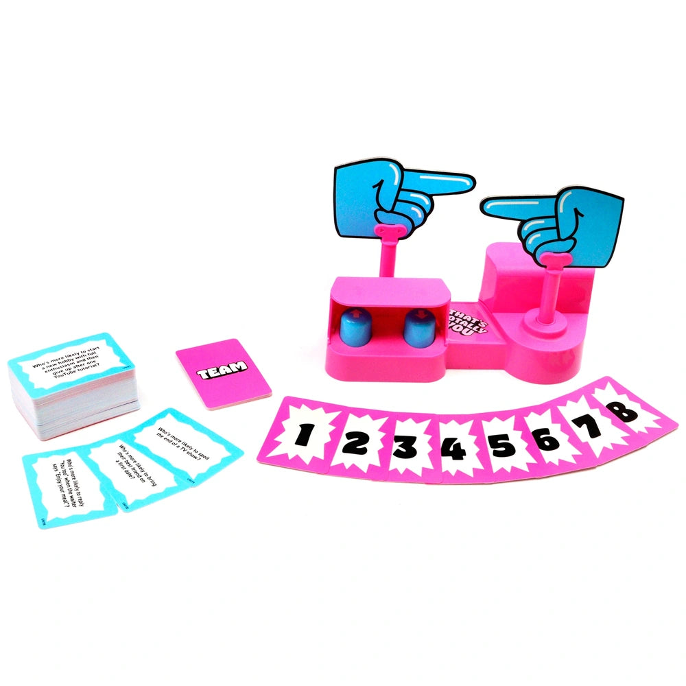 Thinking the same is every team's mission in the That's Totally You Game! You're trying to silently agree with your partner by both pressing the buttons on your swivel hands so the fingers swing round and point at the same person. This adds a fun, physical twist to each decision.