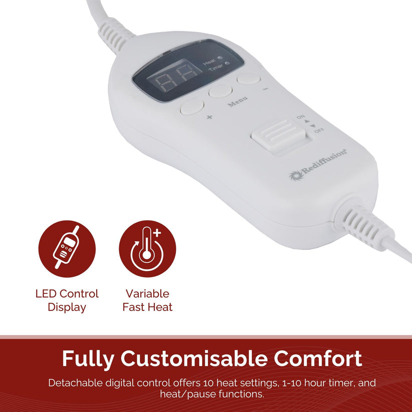 Adjust the temperature to your liking with 10 heat settings, and customise your experience further with a 1-10 hour timer, complete with heat and pause functions for maximum flexibility. The throw also features an LED control display for easy use and comes equipped with a BS plug for seamless integration into your home.
