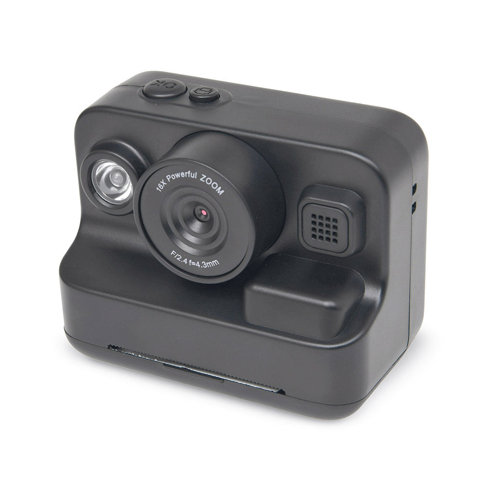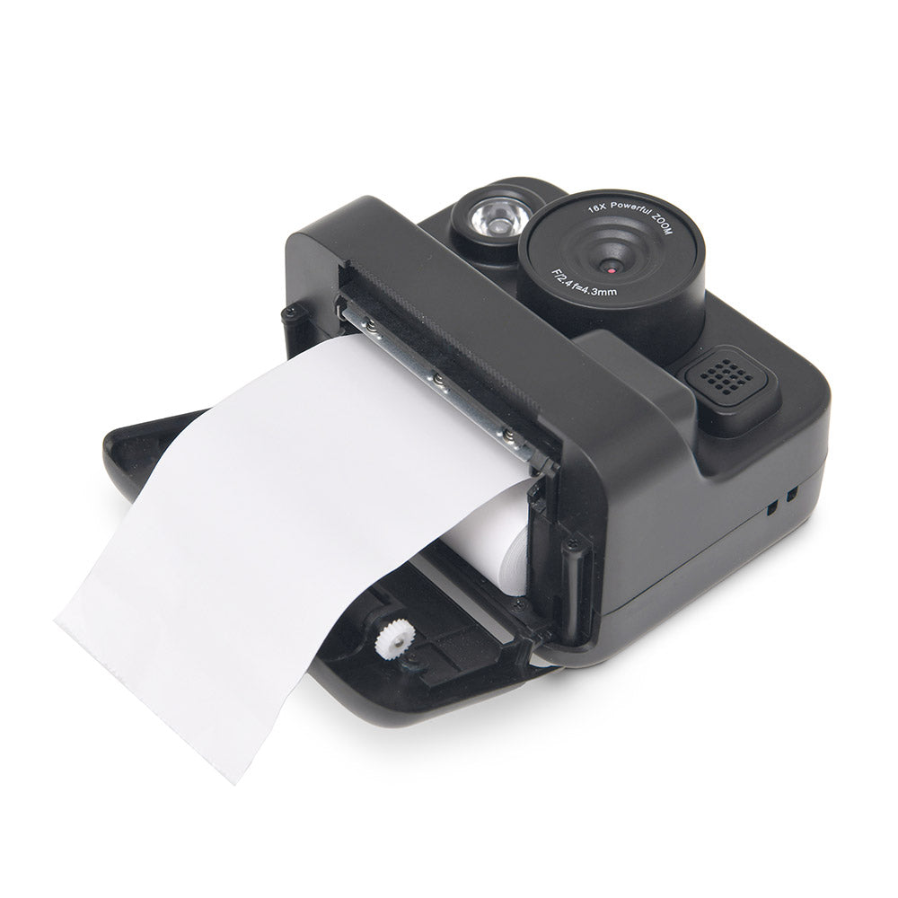 Capture and instantly print black-and-white photos-no ink required. Includes four rolls of photo paper, flash for nighttime, Micro SD slot for storage.