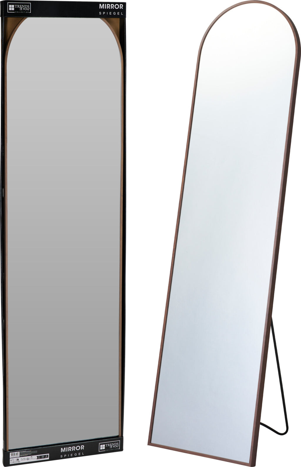 This wood-look standing mirror features an elegant arch shape and a dark wood finish, adding a stylish touch to any room. Crafted from a blend of aluminium-coated alloy, MDF, glass, and iron, it measures 40cm x2.5cm x150cm for a perfect full-length view.