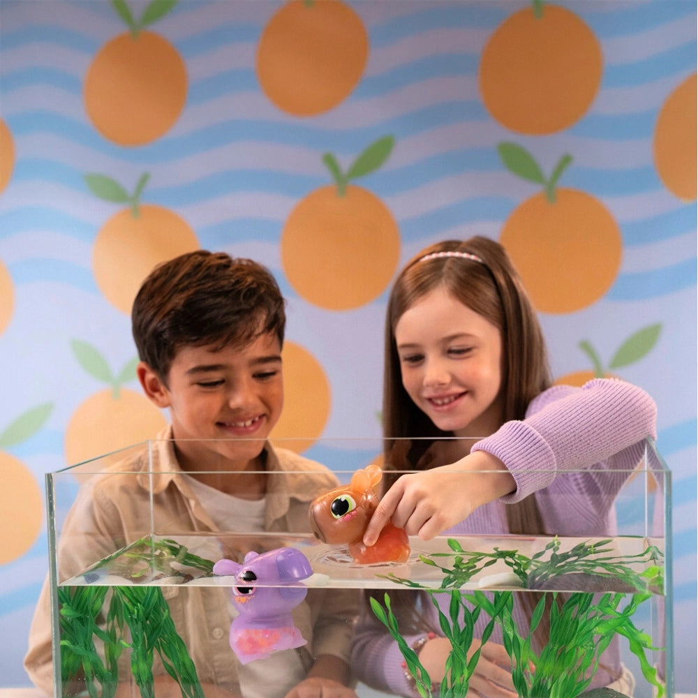 Let's Glo Capybara is your floating squishy light-up pet pal who brings glowing fun to play time! Drop her in water to reveal a magical glow, and squeeze her belly to discover a hidden tangerine! With a super-soft stretchy body, this adorable capybara is perfect for sensory play and water adventures.