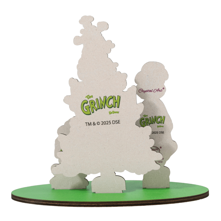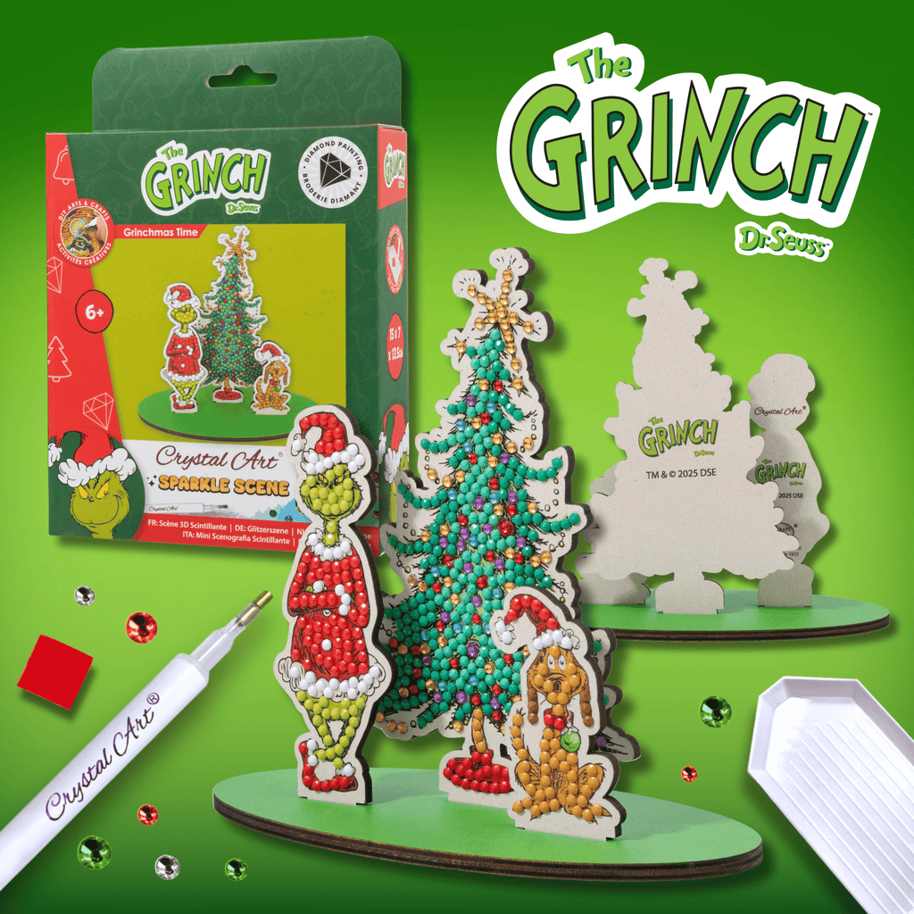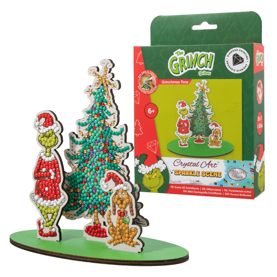 Bring a touch of holiday mischief to your crafts with this festive 'Grinchmas Time' Crystal Art® Sparkle Scene Kit from Craft Buddy. This fun 3D Buildable craft project features the beloved Grinch from Dr. Seuss, his loyal dog Max, and a twinkling Christmas tree, all made from durable MDF pieces that easily slot together - no glue required. Each element is decorated using sparkling crystal gems, turning this fun and easy arts and crafts project into a dazzling holiday display.