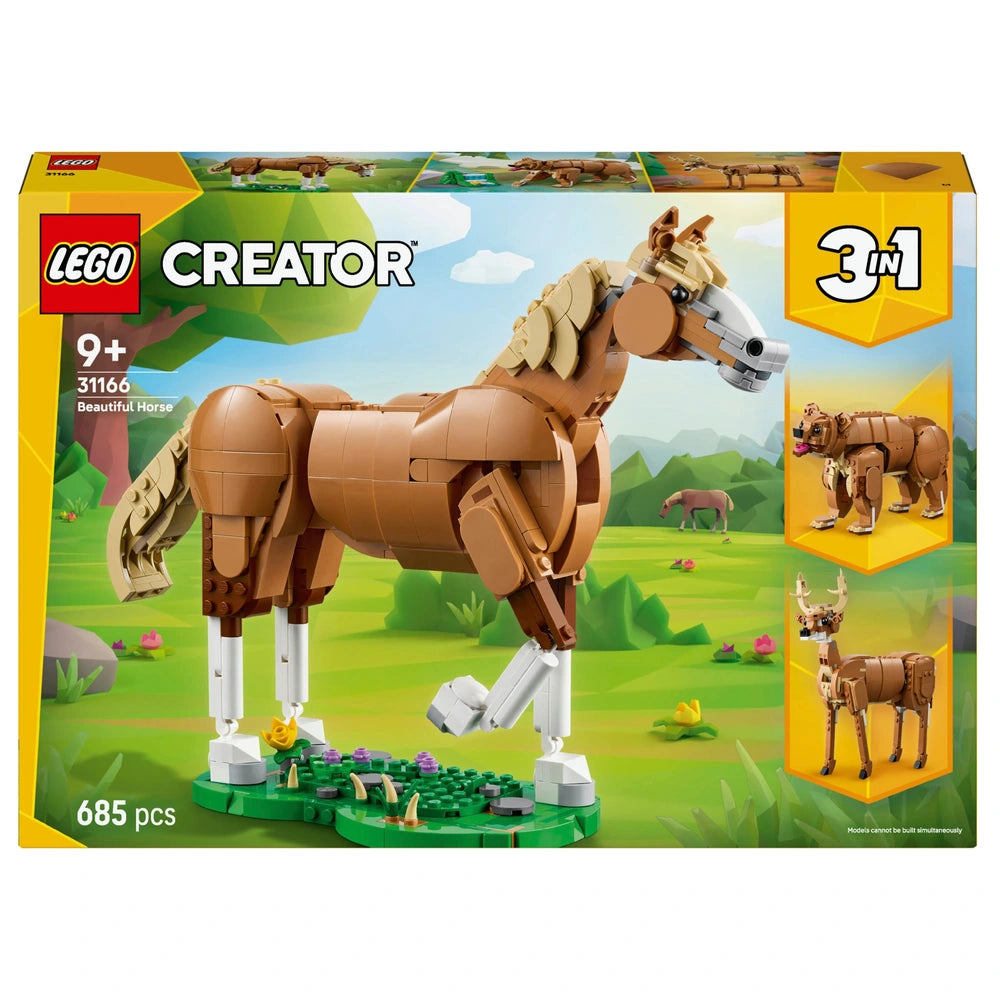 The LEGO Creator 31166 3-in-1 Beautiful Horse Set lets kids create different animal figures with the same bricks. LEGO Creator 3-in-1 sets inspire kids imaginations with 3 different building options in every box, so they can build, rebuild and build again. Please note that models cannot be built simultaneously.