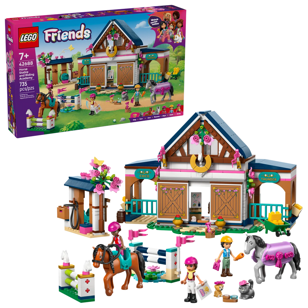 Saddle up for fun times as girls and boys ages 7 and up explore the LEGO® Friends Horse Stable and Riding Academy (42688) set for kids. Play out every stage of caring for horses as Liann and Aliya take lessons with instructor Cindy. Saddle the 2 horses and ride them over the jumps. Then try different jobs like transporting hay in the wheelbarrow or cleaning and feeding the horses. After a busy day, it’s time for a sleepover in the cozy beds above the stables. This pretend play toy comes with lots of accessories so kids can gallop into a different adventure every time they play. The set includes a horse blanket, jumps, wheelbarrow, hay boxes, carrot, whiteboard, trophies, books, beds and more. This set makes a great horse lover gift for girls and boys who love animal figures and horse toys. With the LEGO Builder app, kids can enjoy an intuitive building adventure where they can zoom in and rotate sets using 3D building instructions, save sets and track progress. Set contains 735 pieces.