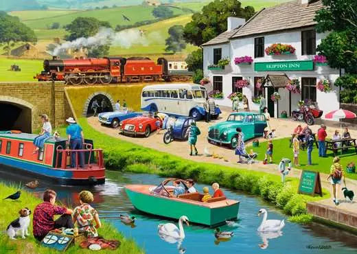 A day spent in the countryside can involve so many different activities.  You might choose to enjoy a good walk, take your motorbike or car out for a run, enjoy a meal at a country pub, hop on board a boat or even enjoy the magic of steam.  This lovely scene depicts just some of the leisure activities waiting to be discovered in the wonderful landscapes of the Yorkshire Dales.