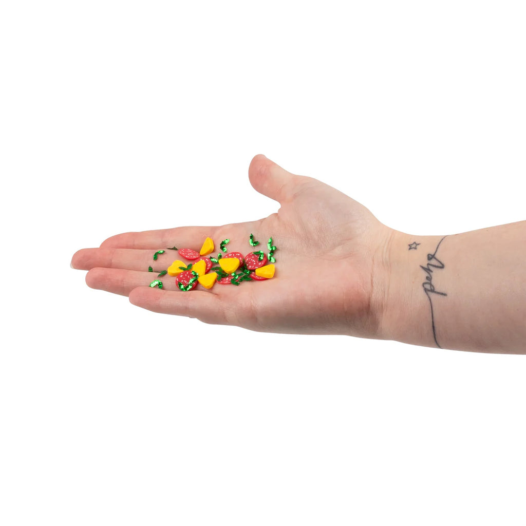 - Slime, putty, and confetti to craft your own pretend pizza