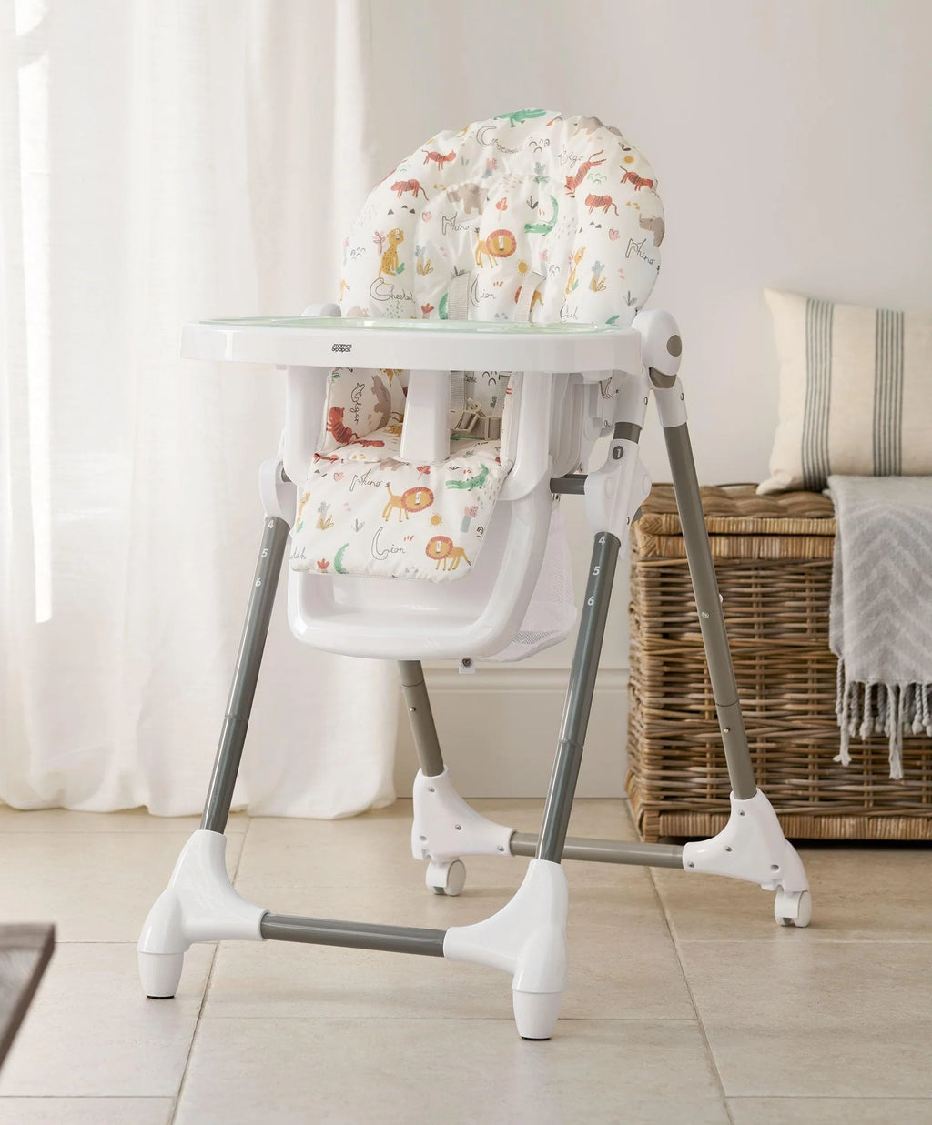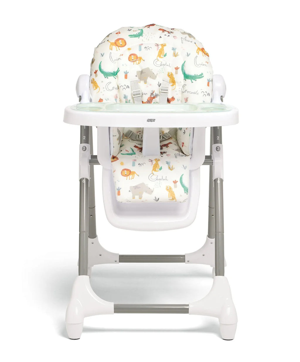 Padded seat made from 100% recycled polyester with 6 adjustable height settings and three recline adjustments, so your child can always join you comfortably at the table. Removeable tray with three adjustable tray settings, so you can adjust tray position as they grow. 5-point harness to prevent slips and falls.