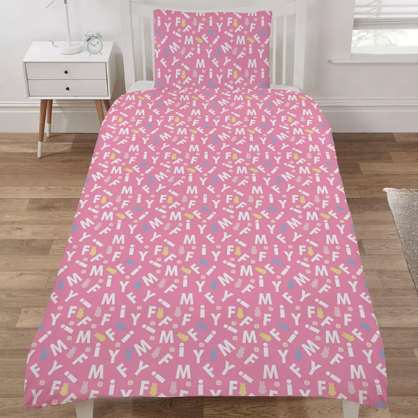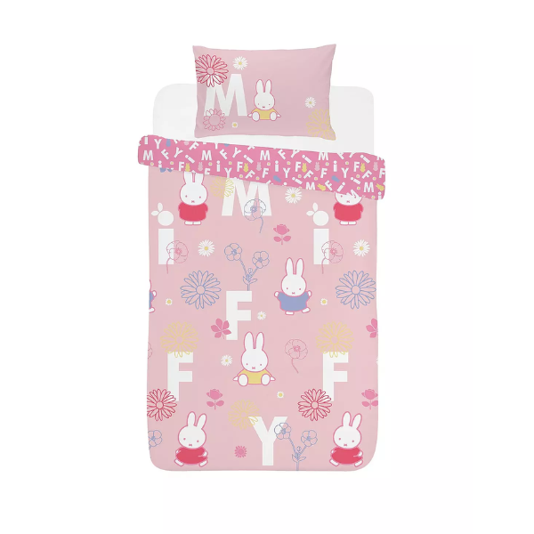 Add a touch of charm and sweetness to your bedroom with this officially licensed Miffy single duvet set. Featuring the beloved Miffy rabbit surrounded by playful flowers and letters, this delightful design is perfect for fans of the classic character. Includes one single duvet cover (137 x 198cm) and one pillowcase (50 x 75cm). 52% polyester/48% cotton. It is machine washable at 40°C and can be tumble dried for easy care.