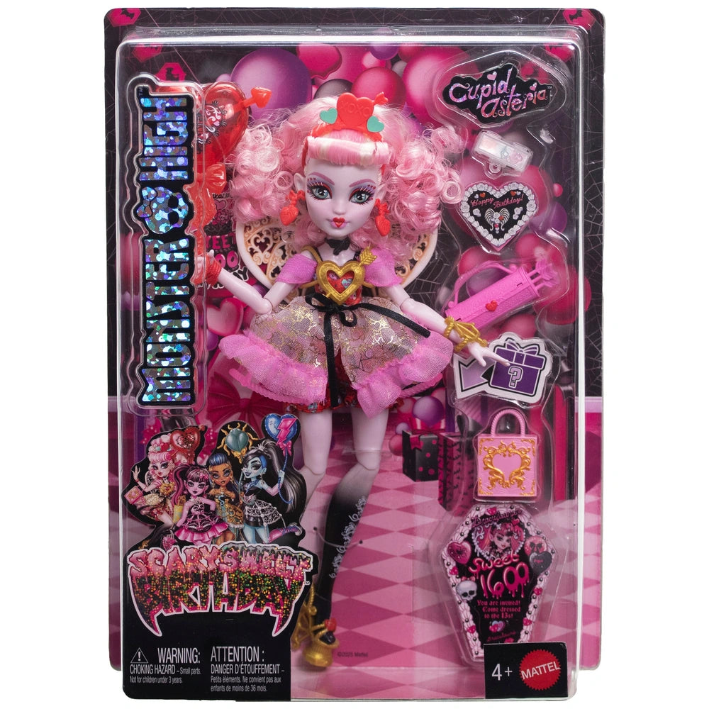Contents: 1x Monster High Scary Sweet Birthday Cupid Asteria Fashion Doll; 7x Accessories