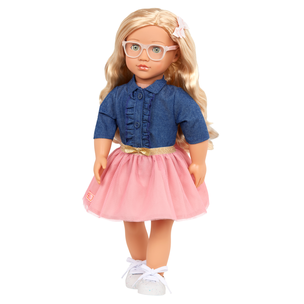 Party-ready and full of fun, Our Generation 18-inch doll Emily loves birthdays and surprise adventures! She has a cuddly soft body and realistically detailed features, from her bright green eyes that open and close to her long, wavy blonde hair that's fun to style! Emily arrives wearing a frilly denim-style top, a tulle skirt with a shimmering gold waistband, cute glasses, and a stylish hair bow. And her pair of running shoes feature real laces to tie! Her outfit also has easy-open closures to quickly put on and remove, so you can mix, match, and create more fun fashion looks!