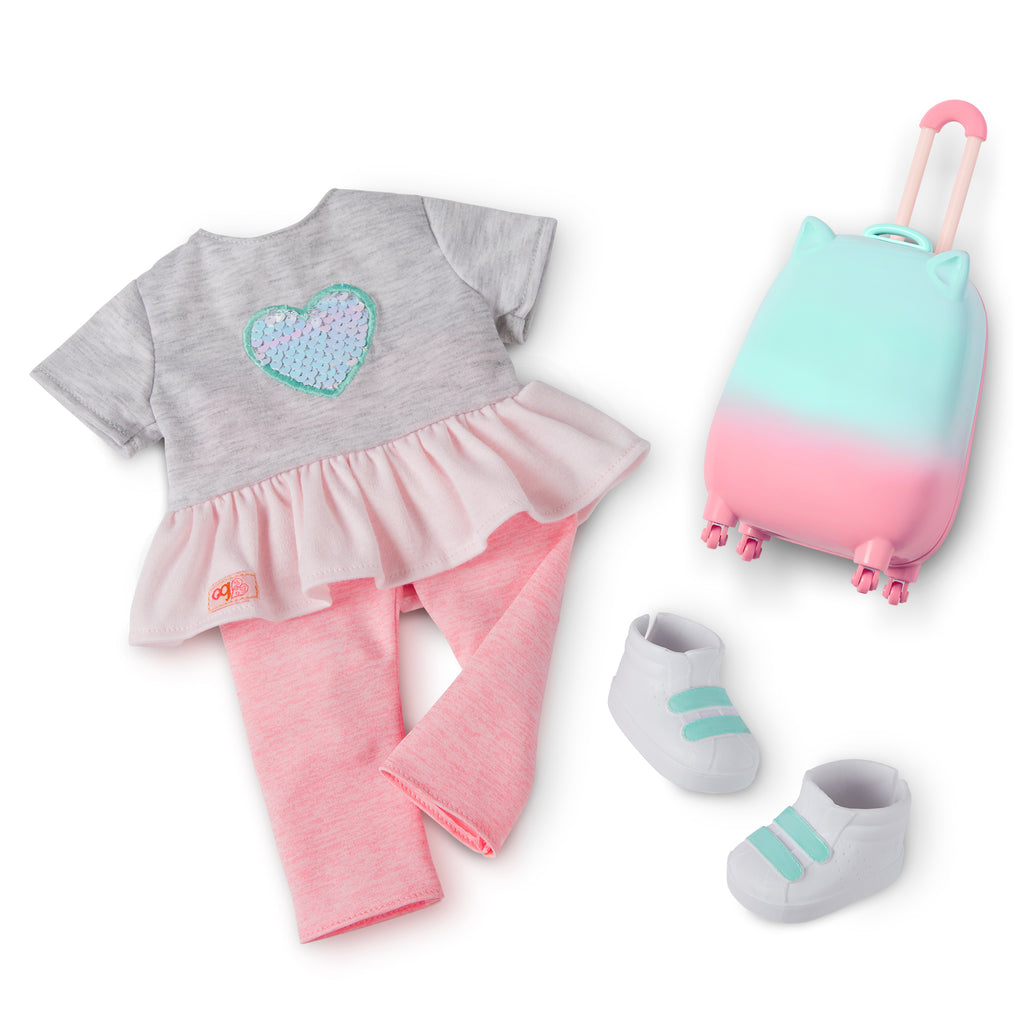 Create endless adventures with Our Generation 18-inch doll Linzi! This adorable travel set lets little explorers play out hours of stories with themed accessories, including a cute cat-ear luggage they can pack and unpack. Plus, it features rolling wheels and an extendable handle for realistic role-play and easy traveling! Linzi is ready to set off in style with a reversible sequin top that kids can flip up and down. She has a huggable soft body and lifelike details to delight doll fans during playtime. Her dark-blue eyes open and close, and her wavy light-blonde hair is fun to style in many ways.