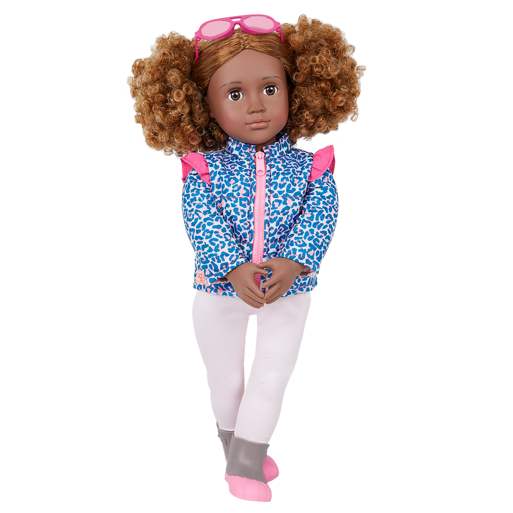 Get spotted in trendy fashion with the Our Generation Lovely Leopard outfit for 46cm dolls! Bundle up with the pink and blue leopard jacket. It features cute ruffle sleeve caps and an easy-to-fasten zipper so your doll besties can explore the outdoors right away! Complete the look with the casual trousers and pair of booties. Then add the sunglasses for extra bright days! This outfit can also be mixed and matched with more fun styles from Our Generation, so your dolls can look fashionable on any adventure! (Dolls sold separately)