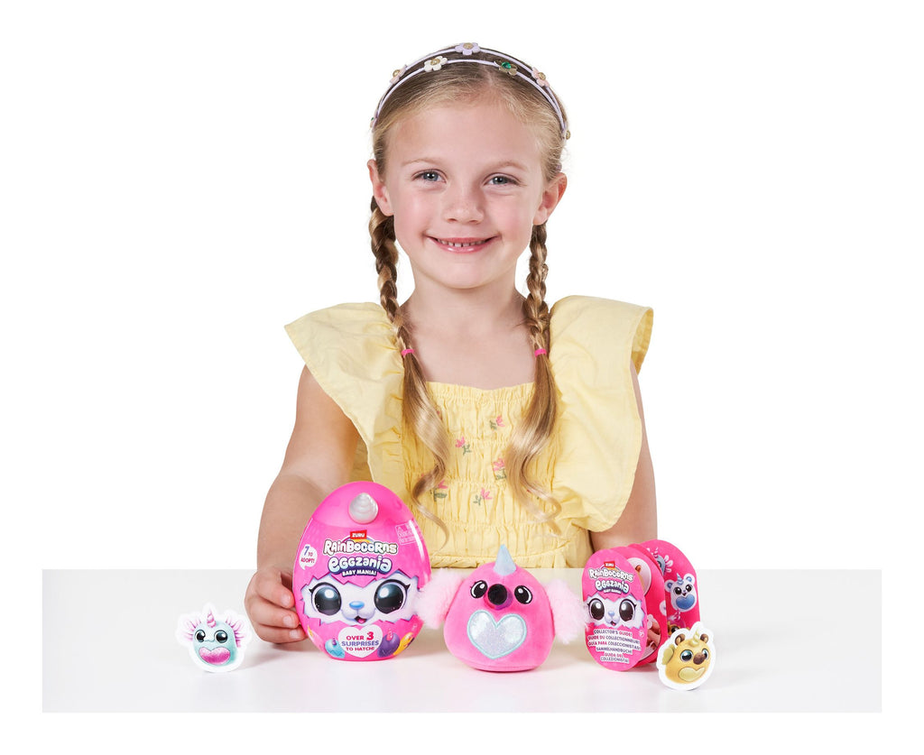 Life's always sunny side up in Eggzania! Your new baby Eggzanias feature glittery hearts on their tummies, adding a magical sparkle. Collect all seven super soft, cuddly plushes, and mark them off on your collector's guide. Can you discover the rare Baby Eggzania? Rainbocorns are the ultimate surprise eggs, blending mystery unboxing with quirky surprises. In Rainboville, magic unfolds with every egg, and the excitement never stops!