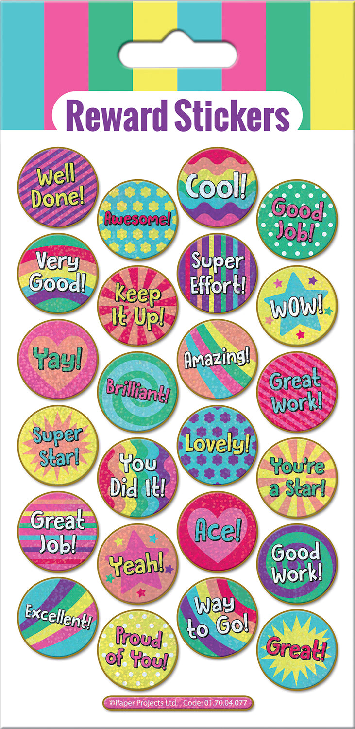 One sheet of reusable foiled stickers packaged with an illustrated backing board.