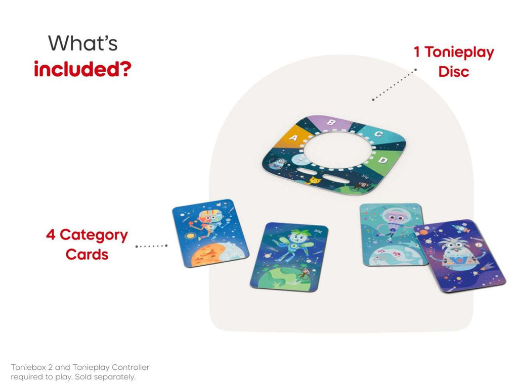 Take a trip through the Animal Galaxy with the Quizzles, the quirky android quizmasters! Made for ages 7+, this Tonieplay Game tests their animal knowledge with 500 questions about jungle beasts, arctic dwellers, ocean creatures and more. Answer correctly to power up planets and unlock facts. Then face Quentin Quizzle in the ultimate round! Tonieplay unlocks new ways to play, only on Toniebox 2. Put the Tonieplay Game Disc and Tonieplay Controller onto the Toniebox 2 to play for victory!