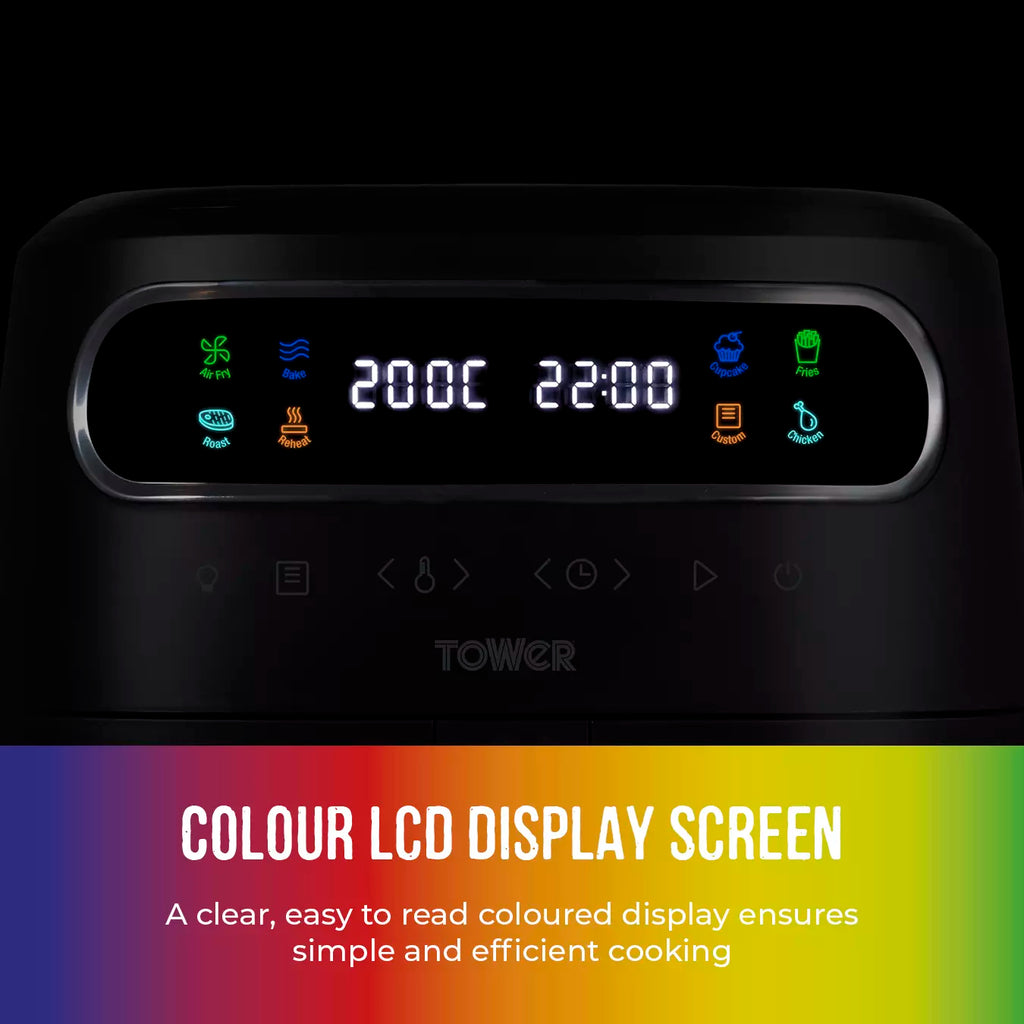 Exclusive to Tower Air Fryers, Vortx technology rapidly circulates hot air around food. Cooking up to 30% faster than a conventional oven and using 99% less oil, saving up to 70% on your energy. The colour display. A clear, easy to read coloured display ensures simple and efficient cooking, with different coloured icons to help choose between the different cooking pre-sets. Choose from 7 one-touch pre-sets to take the guesswork out of cooking, including Air Fry, Bake, Cupcake, Fries, Roast, Chicken & Roast.  Become a star baker creating cakes, tarts or pies with the bake function or grill juicy steaks like a pro with the crisper grill plate. The generous 3L capacity is perfect for cooking family sized meals and can even comfortably accommodate a whole meat joint.