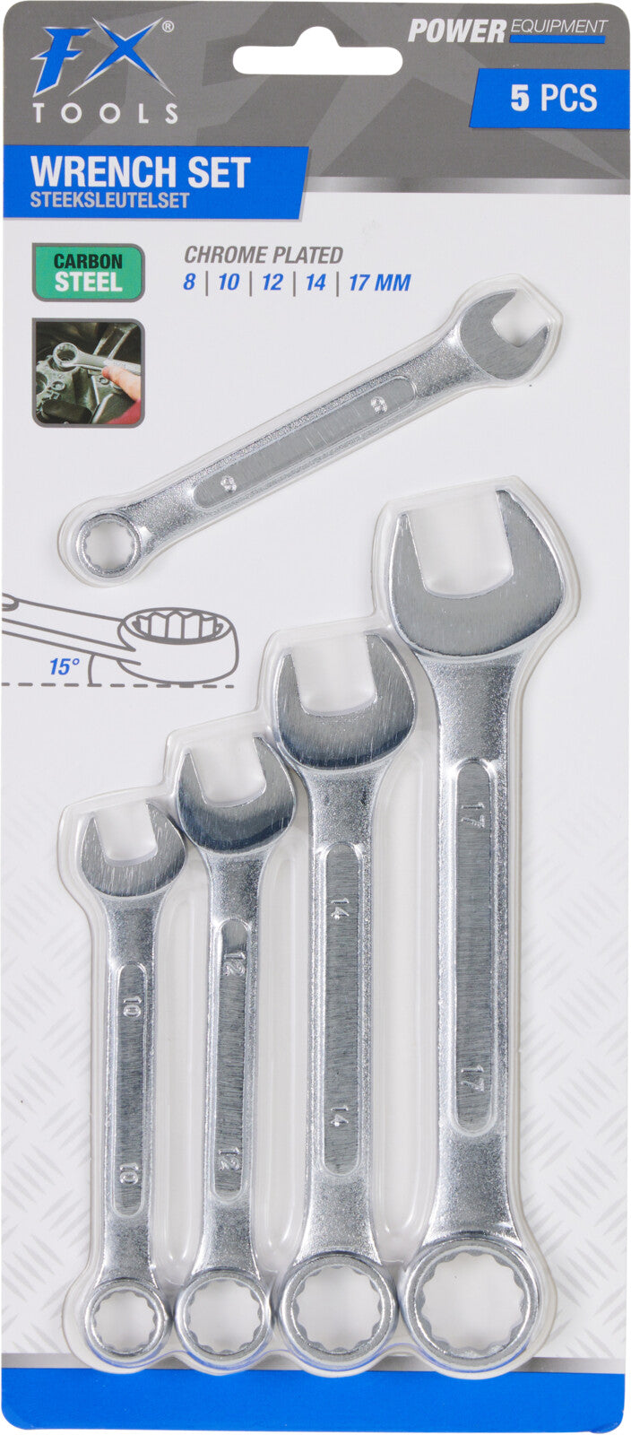 Get the job done right with this practical five-piece wrench set. Constructed from durable carbon steel, this collection includes five essential sizes—8mm, 10mm, 12mm, 14mm, and 17mm—covering most common fastening tasks around the home or workshop. The robust construction ensures reliable performance for tightening and loosening bolts and nuts.