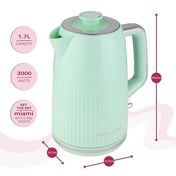 Step into a sunlit kitchen with The Miami Collection, where style meets functionality in every appliance. Inspired by Miami's iconic pastel tones, each piece captures the effortless charm of Art Deco design, bringing a touch of breezy sophistication to your home. Crafted to serve as both essential kitchen tools and statement pieces, The Miami Collection transforms your space with practical elegance. 1.7L Capacity: Boil up to 7 cups at once; perfect for serving family and friends.360° Swivel Base & Elegant Design: Effortlessly lift and replace the kettle from any angle with the 360° swivel base, perfect for left or right-handed use. The stylish, elegant pattern on the body adds a touch of sophistication to any kitchen. Boil-Dry Safety Protection with On/Off Indicator Light: Enjoy peace of mind with automatic boil-dry safety shut-off, ensuring safe use every time. The illuminated on/off switch signals when your kettle is in action, so you know exactly when ready. Removable Limescale Filter for Easy Maintenance: Maintain optimal performance with the removable limescale filter, designed for easy cleaning to keep your kettle in top condition. Easy-to-Read Water Window: Check water levels at a glance with the clear water window, ensuring precise measurements every time you fill.