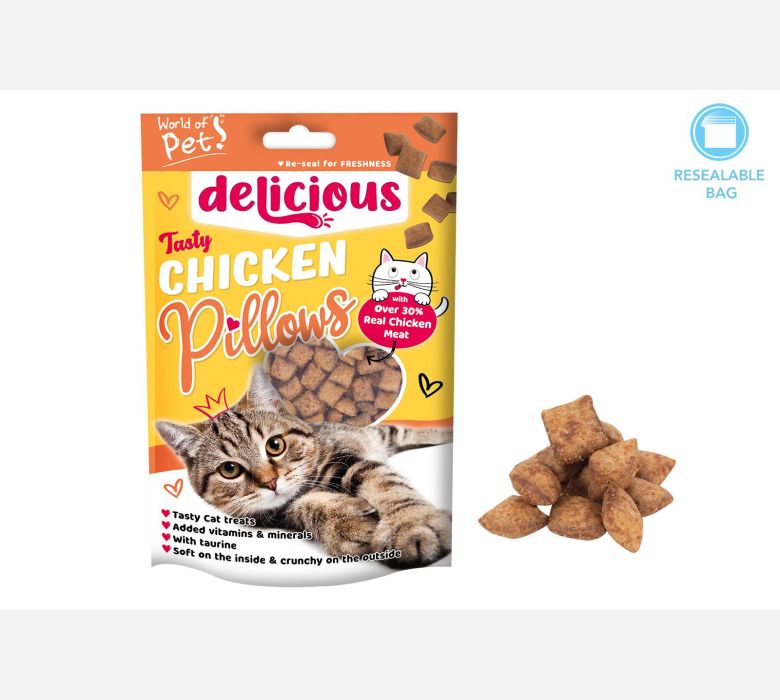 Delicious chicken filled pillow treats for cats. Perfect for a tasty snack or for rewarding good behaviour.