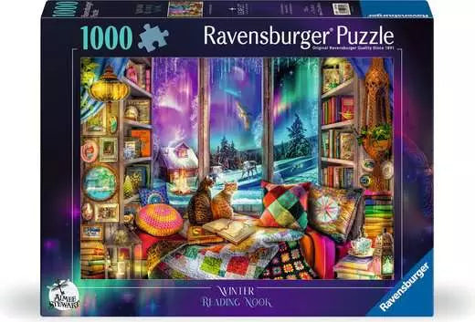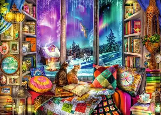 Escape into a cozy retreat with this enchanting 1000-piece jigsaw puzzle. The scene captures the perfect spot for relaxation, featuring a snug window seat surrounded by shelves filled with books. Outside, snow gently falls, creating a peaceful winter wonderland, while inside, two cats sit contently by the window, gazing at the snowy landscape. The warm glow from the room and the inviting atmosphere make this the ideal place to unwind with a good book. As you assemble this charming puzzle, you'll feel the comfort and serenity of a quiet winter day spent indoors.