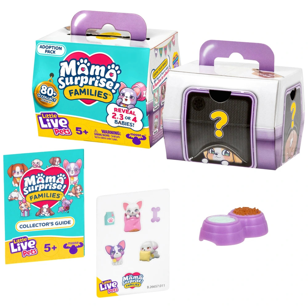 Expand your Little Live Pets Mama Surprise Families with the exciting Adoption Pack! Unbox the adorable puppy carrier to reveal 2, 3, or even 4 surprise babies inside. If you uncover fewer than 4, a special accessory is included to add to the fun!