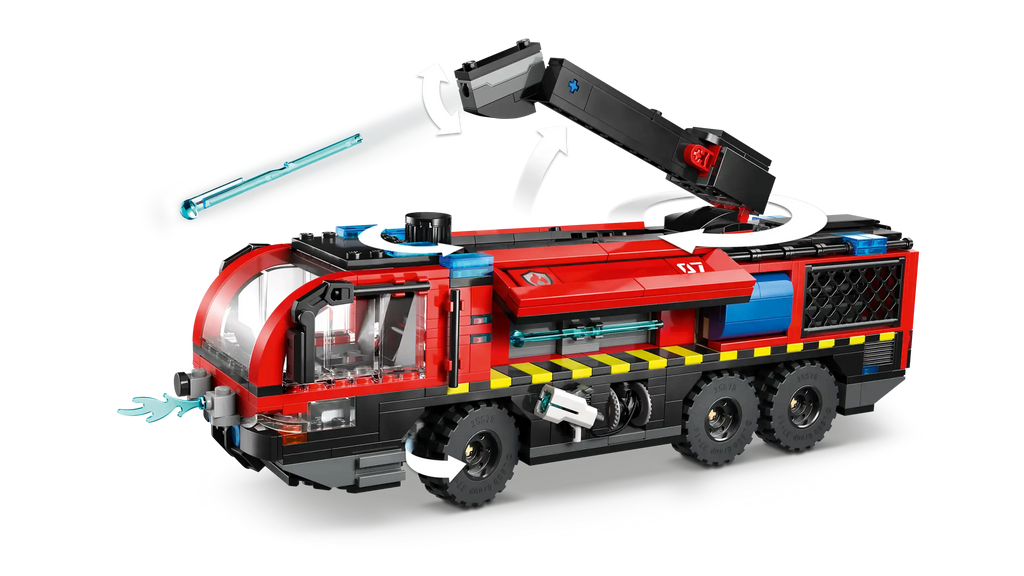 Mobilize the LEGO® City Airport Fire Truck (60499) for kids ages 7 and up. This realistic emergency vehicle toy features a 360° rooftop extinguisher, opening side equipment bays and tool storage compartments. Kids can turn a dial to steer the truck, launch water elements from the extinguisher and remove the engine for repairs. The toy truck comes with 8 chunky rubber tires and a detailed cockpit with seating for the 4 firefighter minifigures. Just add a sprinkle of imagination to ignite hours of heroic firefighting adventures. This toy truck building set makes a great birthday or any-day gift for kids with a passion for hands-on play. Use it with other LEGO City sets (sold separately) for even bigger adventures. Kids can build with confidence using the LEGO Builder app where they can zoom, rotate in 3D and track progress with easy-to-follow digital instructions. Set contains 691 pieces.