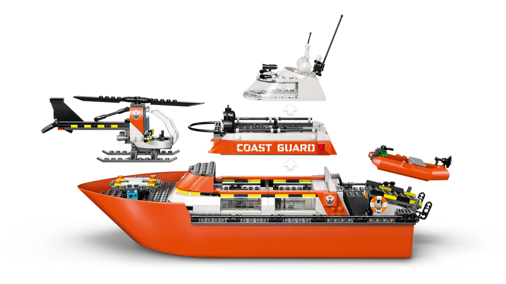 • WHAT’S IN THE BOX – Includes everything kids needto build a floating LEGO® coast guard patrol boat, toy rescue helicopter and 2 floating dinghies, plus 5 minifigures and a dog figure