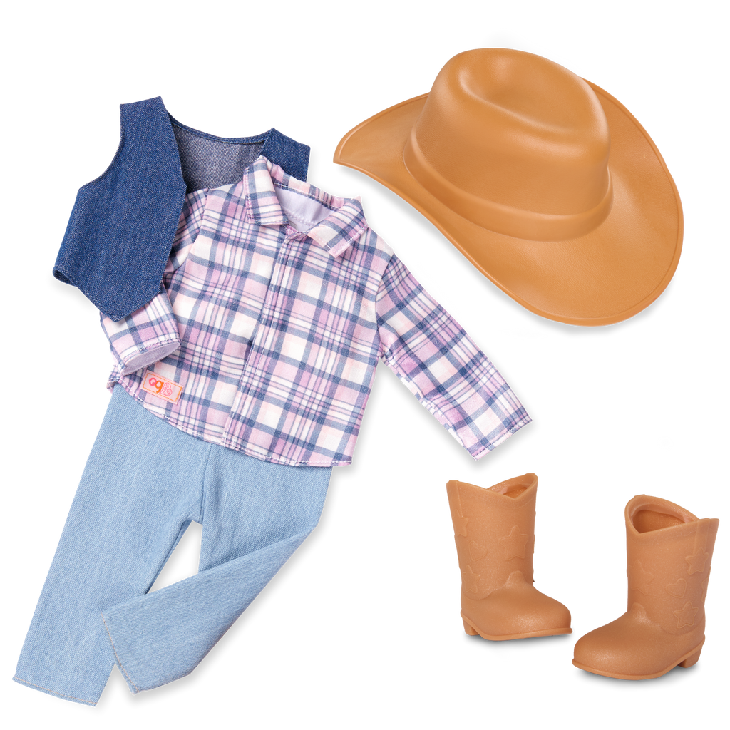 Ashleigh! This Western-inspired doll lets her cowgirl personality shine in a denim-style outfit paired with a trendy plaid top. Her country look is complete with a curved-brimmed cowboy hat and tall riding boots, perfect for taking horse-riding adventures! With a huggable soft body and lifelike features, Ashleigh will delight doll fans during playtime. Her beautiful grey eyes open and close, and her brushable light-blonde hair is fun to style in many ways. For kids who love dress-up, her easy-change outfit inspires mixing and matching to create endless looks on every journey.